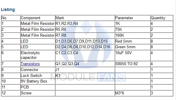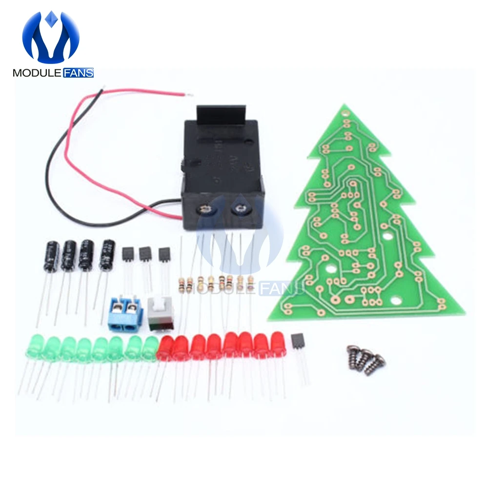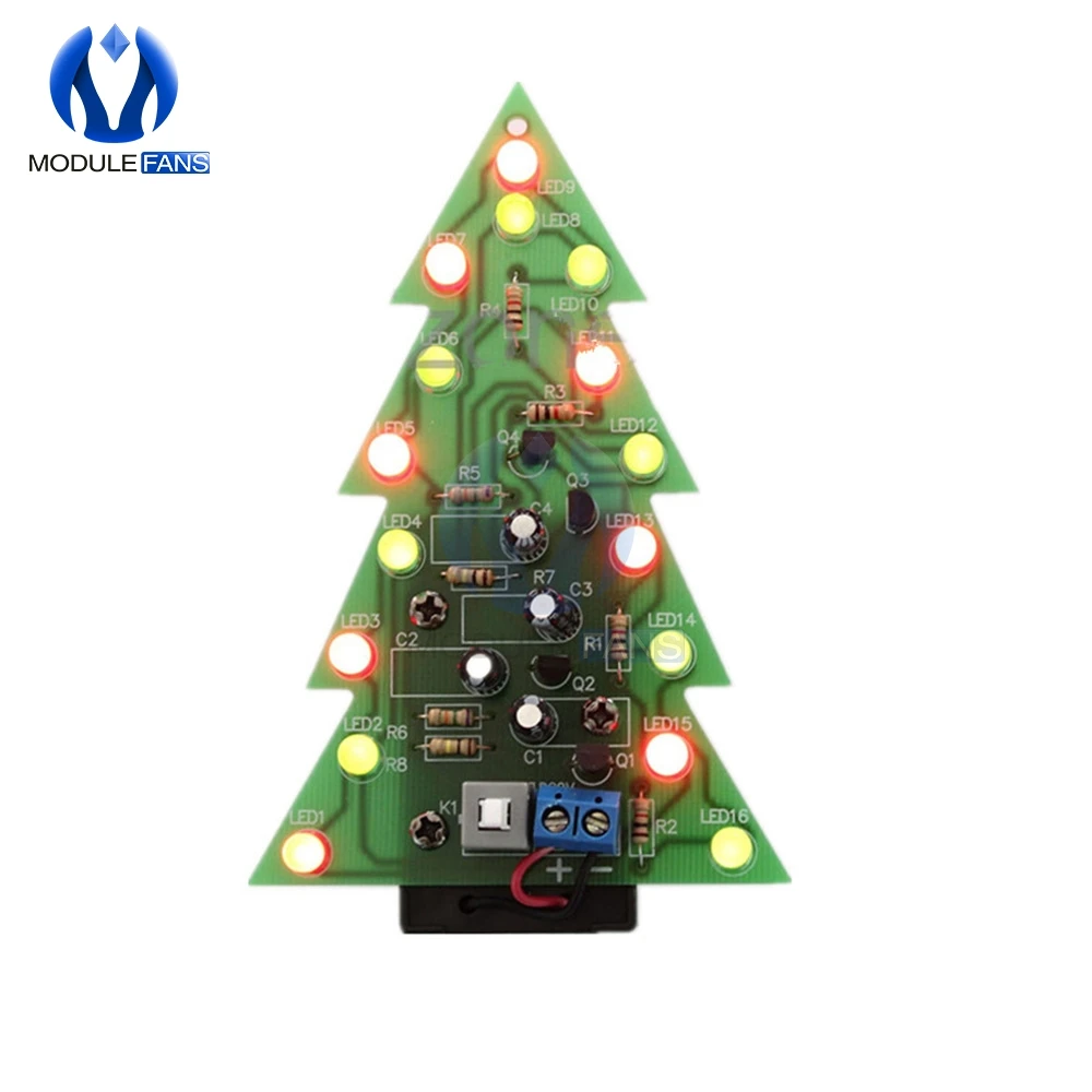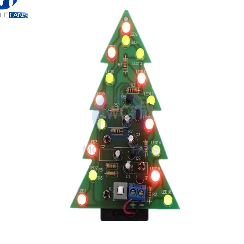 Эта схема состоит из 16 шт. светодиодный (светоизлучающий диод). Светодиодный индикатор 16 шт. разделен на четыре группы, каждая группа имеет различные частоты мигания, когда четыре группы мигают вместе. Этот товар выглядит как Маленькая Рождественская елка. Цепь питается от аккумулятора 9 В. Яркие пятна: Эта схема проста и практична, низкое энергопотребление. Она использует Интегральные схемы для вождения: меньше Части, и линия проста и легка в использовании. Комплект внешней проводки: с подключенной вилкой для легкой замены деталей в любое время и благоприятной отладки цепи. Также позволяет нам углубить наше понимание принципов цепи в процессе отладки. Эта линия находится в форме колебательной цепи с помощью цикла, генерируемого следующими принципами: 1. После первой зарядки конденсатор C1 и C4 заряжается полностью. 2. Конденсаторы C2 и C3 будут продолжать заряжать. 3, когда транзистор Q1 и Q4 включен в то же время, он разрядит конденсатор C1 и C4. 4, конденсаторы C2 и C3 полностью заряжены, транзистор Q1 и Q4 будет закрыт, а также заряжает конденсатор C1 и C4 снова. 5. Транзисторы Q2 и Q3 включены, в то время как конденсатор C2 и C3 будет разряжен. По аналогии, скорость вспышки-это частота колебаний, а частота определяется значениями резистора R & ёмкости C. Комплект: печатные платы PCB, компоненты аккумуляторной коробки. (Без батарей) Размер платы: 70 мм * 110 мм