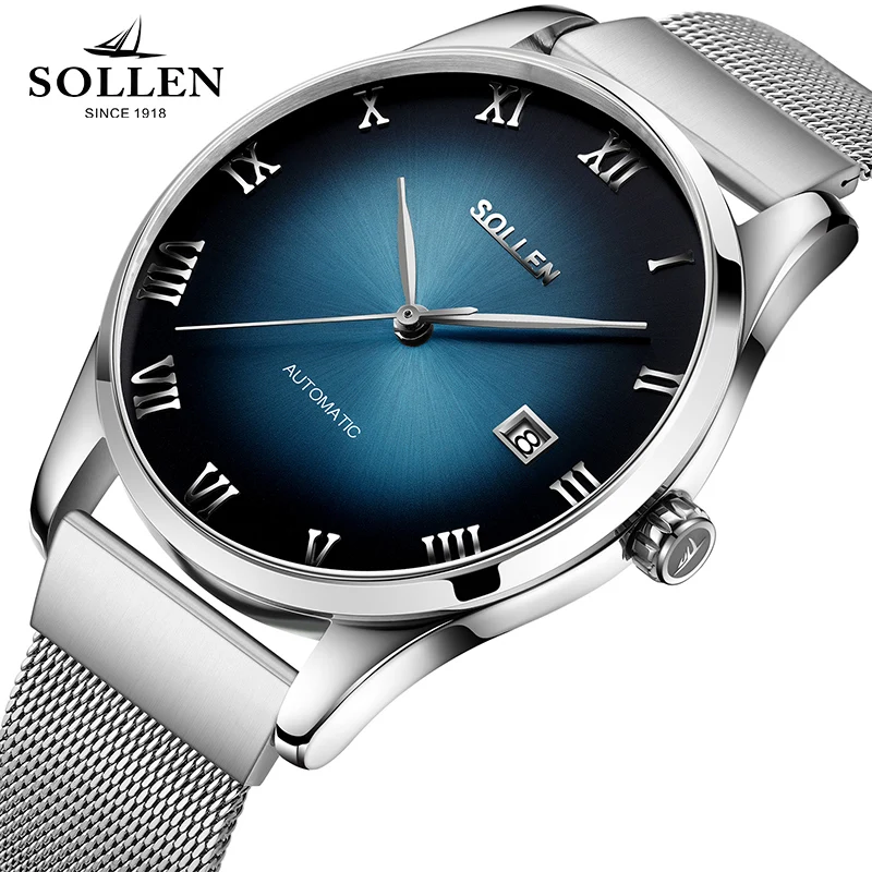 SOLLEN Топ Роскошные Мужские автоматические механические часы Брендовые мужские часы ультра тонкие наручные часы из нержавеющей стали с сеткой и датой