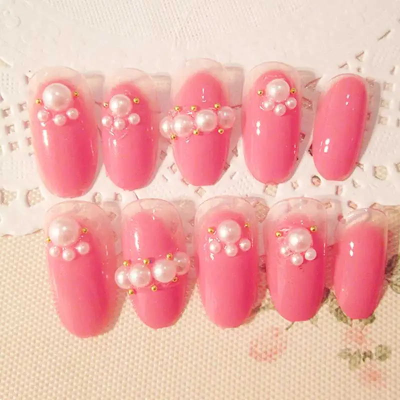 24 Pcs Pink False Nails Finished Products Bride Wedding Nail Tips Manicure Design Acrylic Artificial Fake Nails Pearl decoration
