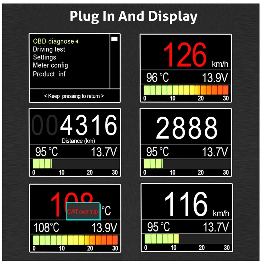 Продукт подходит для стандартных OBD-II транспортных средств на бензине и дизельном топливе, особенно для транспортных средств без температурного датчика, тахометра и расходомера топлива. этот продукт является многофункциональным инструментом OBD с стильной и компактной формой. Он предназначен для установки через разъем и воспроизведение OBD порта без резки провода, легко и просто установить.