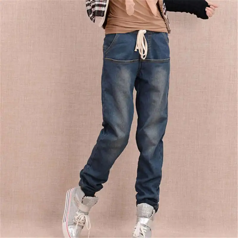 Женские зимние утепленные джинсы на шнуровке с эластичной резинкой на талии, свободные Джинсы бойфренда для женщин, большие размеры, длинные штаны-шаровары, теплые джинсы для женщин