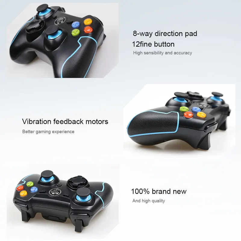 Этот игровой контроллер не имеет функции Bluetooth, используя зрелую технологию беспроводной передачи 2,4G! Превосходное автоматическое подключение. Использование высокопроизводительных чипов, геймпад в игре имеет лучшую стабильность, высокоточные рокеры 360 °, задержка почти равна нулю, поддерживает все виды устройств android. Поддержка ПК, ТВ-бокса, смартфона Android, PS3 и т. д. с дизайном кривой человеческого тела, вы не будете чувствовать усталость, даже если вы зависимы от игры в течение длительного времени