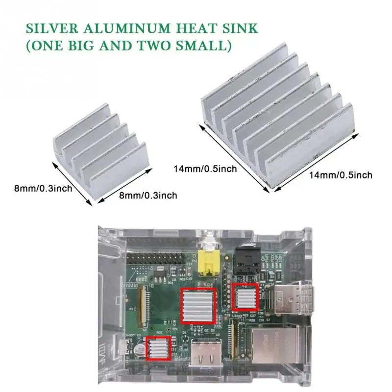 Теплоотвод поставляется с клеем, который более удобен в использовании. Сначала Оторвите заднюю часть клея, разложите его на чипе для материнской платы Raspberry Pi, аккуратно прижмите его плотно. Обратите внимание, что Raspberry pi не входит в комплект.