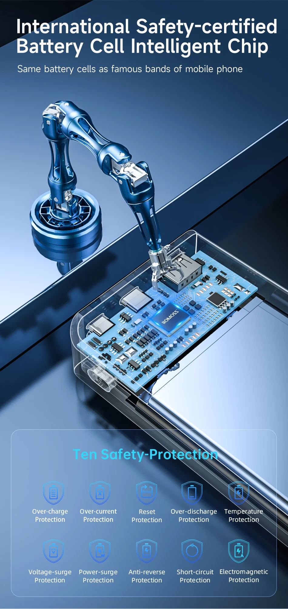 Встроенный внутренний защитный Сертифицированный аккумулятор и интеллектуальный чипСоответствие стандартам FCC CE ROHS EAC10 предохранительная система (перезарядка, Перегрузка по току, сброс, перегрев, перенапряжение, переразрядка, защита от обратного хода, перенапряжение, короткое замыкание, защита RFI)