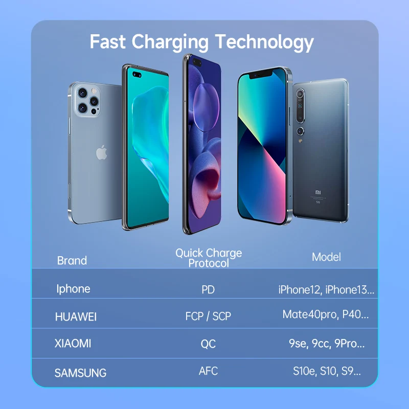 Совместимость с протоколами быстрой зарядки (PD QC FCP APC и т. д.)IPhone/Xiaomi/Huawei/Samsung
