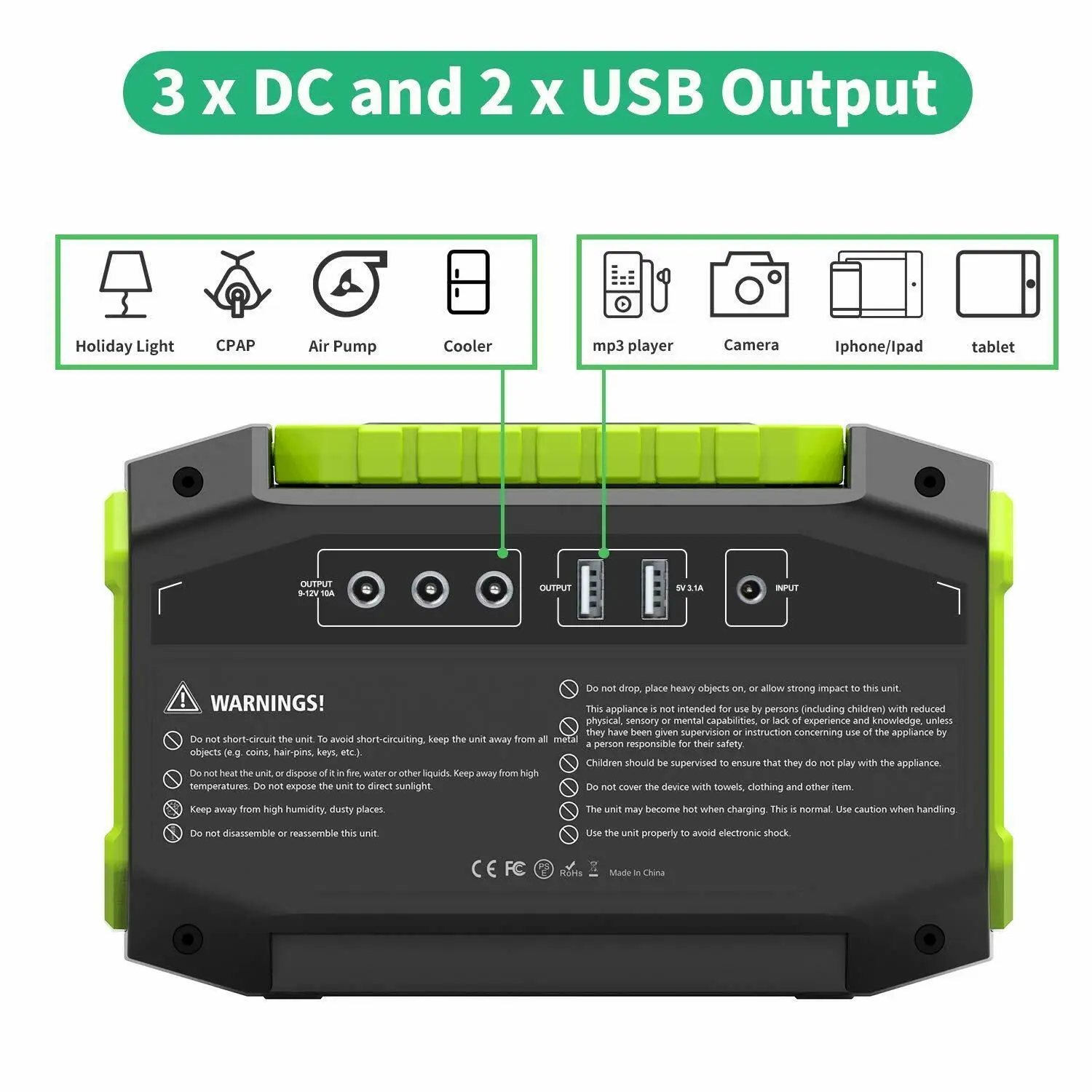 Легкий и компактный источник питания можно брать с собой в любое время в выходные, праздничные дни, в поход или в путешествие. Удобный и отличный инструмент на открытом воздухе служит для зарядки ваших устройств, обеспечивая Аварийное резервное копирование во время путешествия. Может обеспечить длительную мощность для зарядки различных устройств, включая ноутбуки, телефоны, планшеты, камеры, дроны, CPAP машины, небольшие бытовые приборы и многое другое.