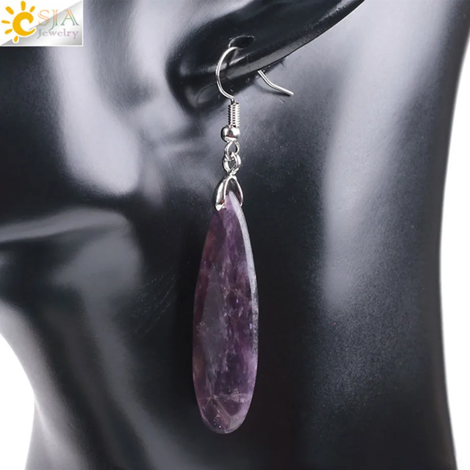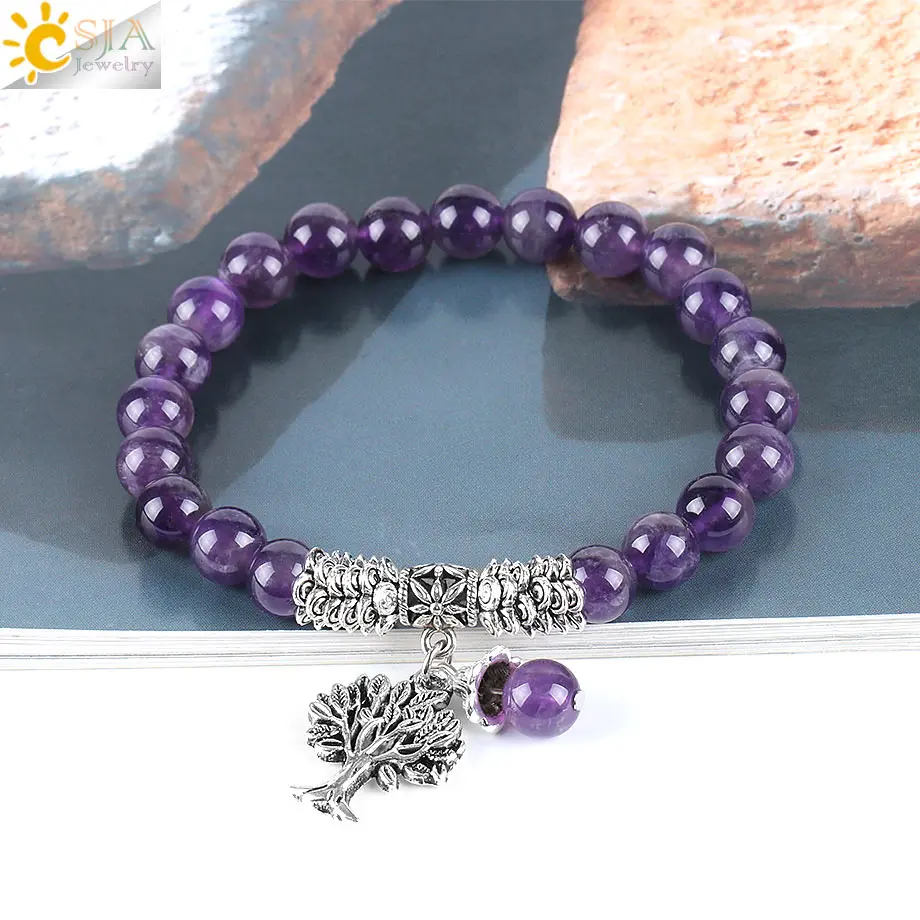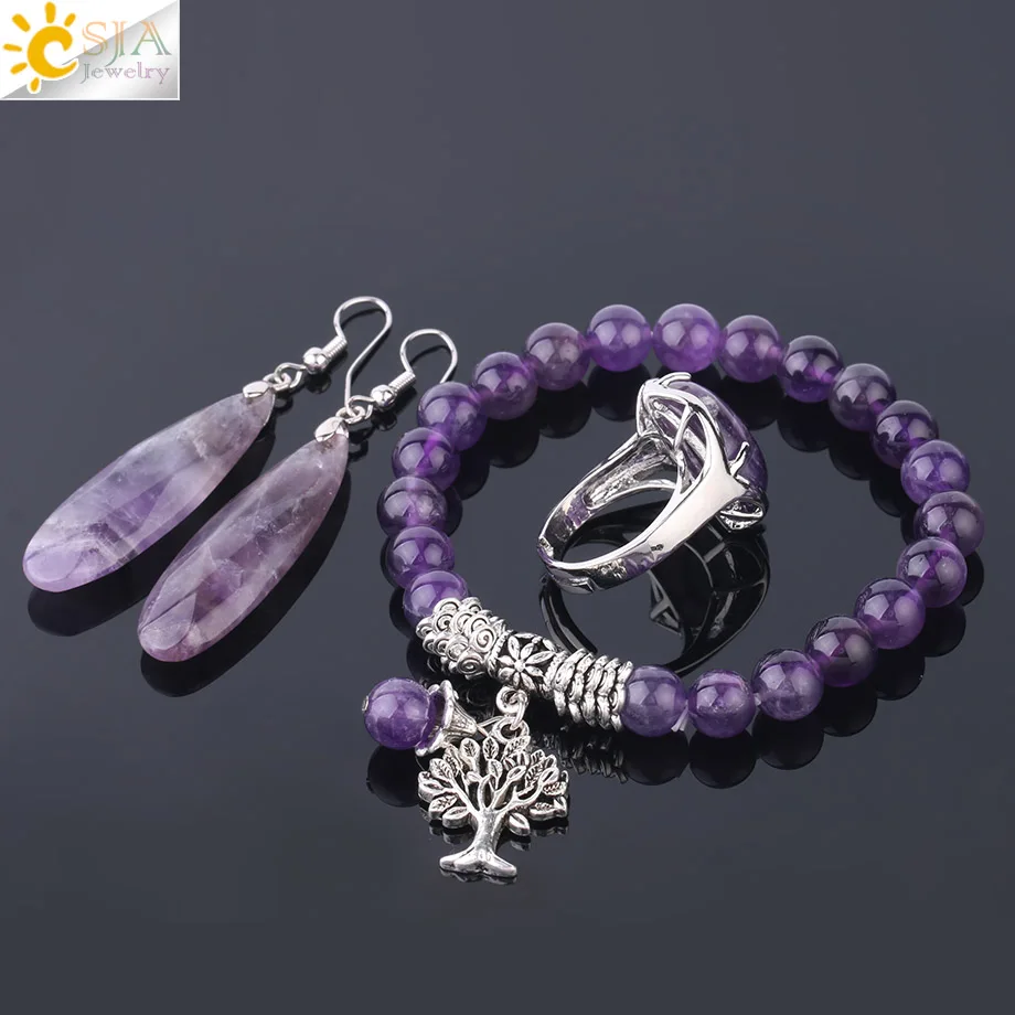 Фиолетовые Кристальные украшения CSJA, набор женских браслетов для медитации древо жизни, серьги-подвески из натурального камня, овальное обручальное кольцо F666 |