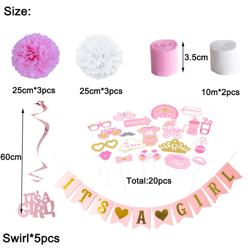 Стиль 1: 3cps 25 см, в белом и помпонами 3 шт 25 см светло-розовые помпоны 2 шт розовые креперные бумажные стримеры 2 шт белые креперные бумажные стримеры 1 упаковка (5 шт.) ) Swirl украшение для девушки (около 60 см в длину) 1 упаковка (20 шт) девушка ребенок душ фото стенд реквизит 1 шт. печатный баннер "It A GIRL"