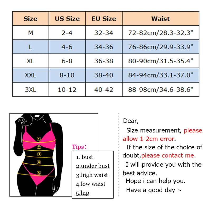| 1. Эта информация о размерах одежды только для справки и позволяет 1-2 см (0,8-0,4 ") различия, из-за ручного измерения, спасибо! 2. цвет товара, отображаемый на фотографиях, может немного отличаться на мониторе компьютера, так как мониторы не откалиброваны одинаково. 3. Пожалуйста, строго следуйте таблице размеров, чтобы выбрать размер. Не выбирайте точно в соответствии с вашими привычками. |