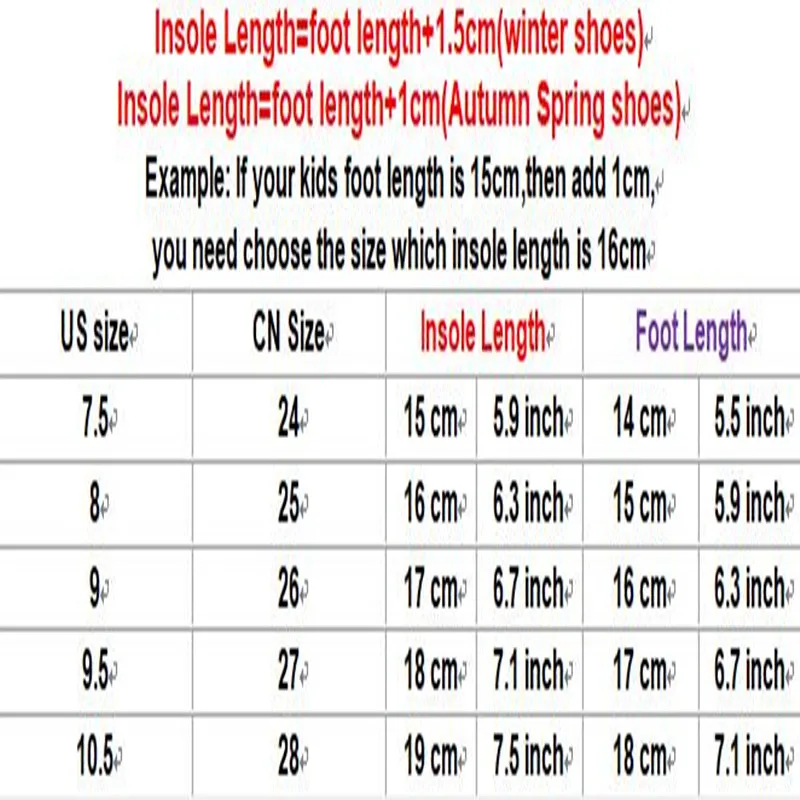 Пожалуйста, сначала Измерьте длину стопы вашего ребенка в соответствии с нашими правилами, а затем выберите подходящий размер в соответствии с таблицей размеров обуви. Например, если длина стопы вашего ребенка составляет 15 см, вы можете выбрать размер США 10,5 (CNsize 26), но если у вашего ребенка широкая стопа, вы должны выбрать на один размер больше, чем