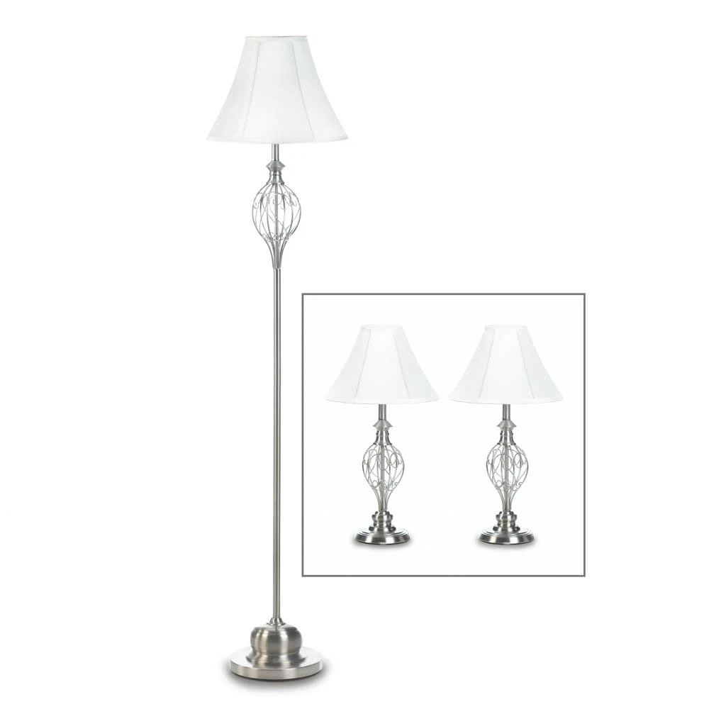 Вы можете утроить количество красоты в вашей комнате, просто добавив этот комплект из трех предметов! Вы полюбите замысловатый дизайн scrollwork 2 светильников таблицы и высоких светильников пола, все в high-polish Серебристый Стальной с тканевые оттенки. Вы можете использовать их все вместе в одном пространстве или разложить их вокруг дома для освещения стиля.