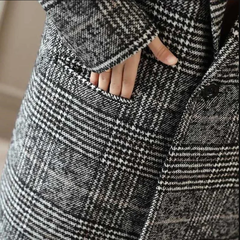 2018 Autumn Winter Women Wool Blends Coat Fashion Plaid Long Woolen Coat Single buckle Loose Women Wool Coats Gray C300