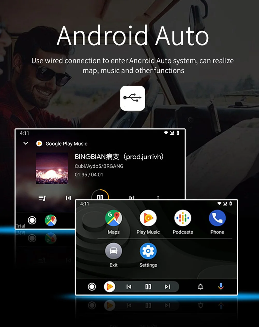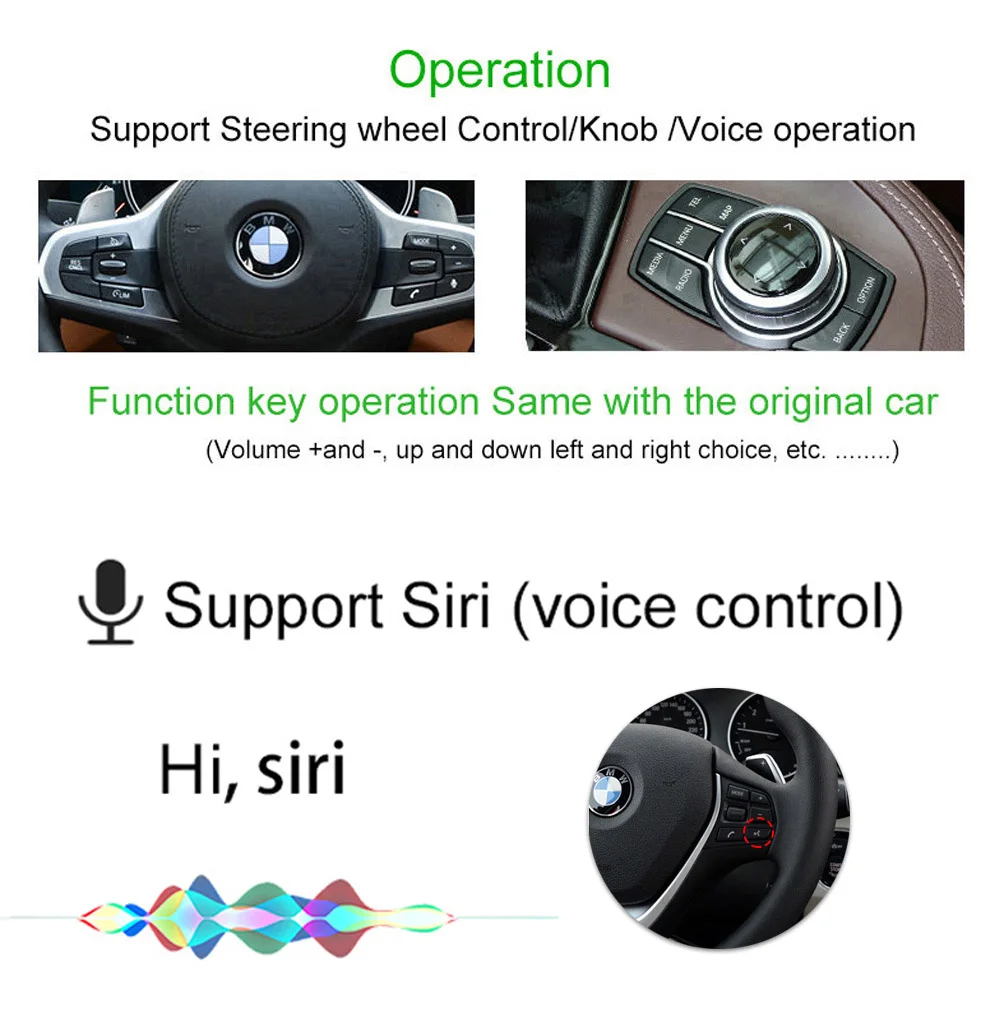 1. Работа с беспроводной Apple CarPlay, сопряжение по Bluetooth, передача через Wi-Fi. 2. Новая функция Airplay, подключение к usb-кабелю, воспроизведение фильмов/навигации/музыки с iPhone 3. Работает с проводным CarPlay также, сначала выключите wifi, подключите через кабель освещения (проводное Удерживайте телефон одновременно) 4. Android Auto, Android Mirroring-Link для телефонов Android (ссылка для скачивания) 5. GPS навигационные приложения, Google Maps, Waze и Apple Maps доступны, информация о живом движении 6. Музыка яблоки Spotify,Apple Music, Amazon и т. Д. Аудио через фабрики PCM медиа, текст показать на дисплее для некоторых приложений. 7. Голосовое управление с помощью «Привет, Siri… 8. Aftermarket фронтальный/задний/360 вход камеры. (Поддерживаются динамические Направляющие линии) 9. USB флеш-накопитель для воспроизведения музыки и видео с помощью Подключите usb-порт от CarPlay комплект 10. Регулируемая EQ. Лучшее качество звука. Выберите ваш любимый стиль свободно (поп, рок, мягкий, стандарт ..) 11. ПОЛНЫЙ OEM кнопки управления.