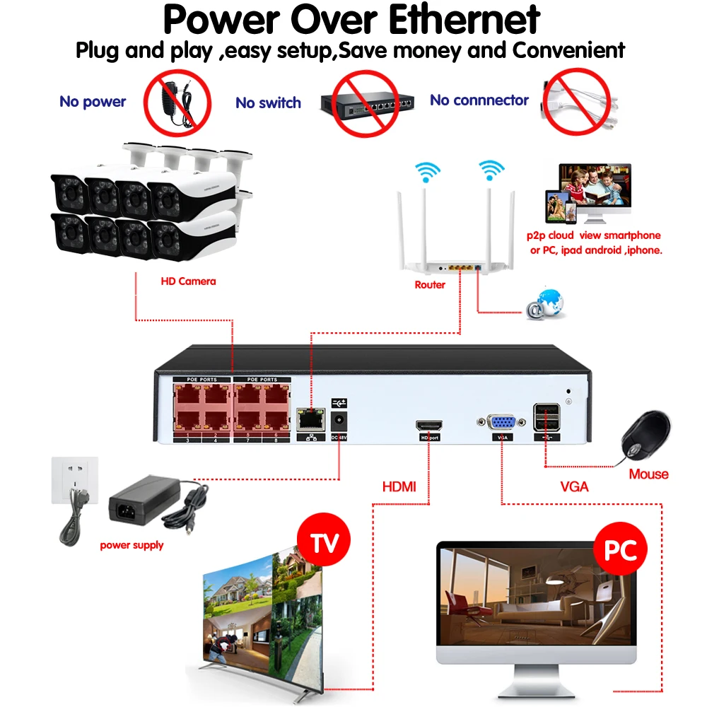 Простая настройка, всего 4 шага для просмотра мобильного телефона,Просмотр видео в режиме реального времени в системе из любого места и в любое время с помощью смартфона, стола или ПК с передовой технологией P2P, вы можете получить удаленный доступ к вашей системе в течение нескольких минут или меньше, нет необходимости в переадресации, удаленный доступ никогда не был таким простым!
