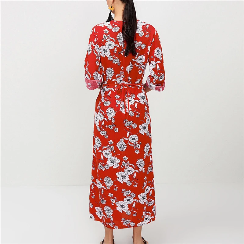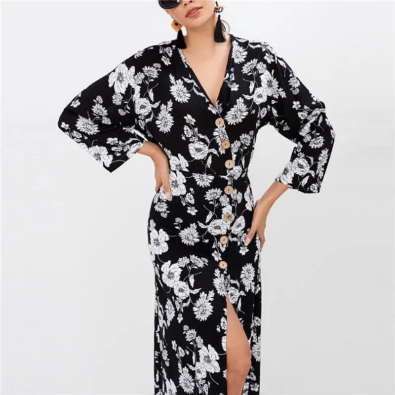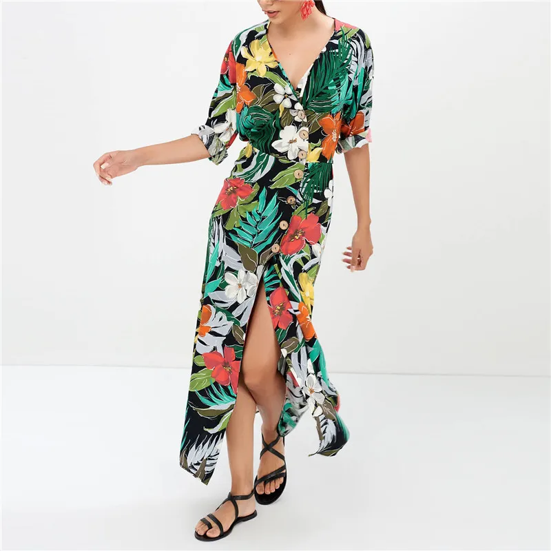 Лето Boho Цветочный принт Для женщин пляжные шифоновые платья весна Повседневное v-образным вырезом кнопка Бандажное платье пикантные Разделение вечерние платье миди