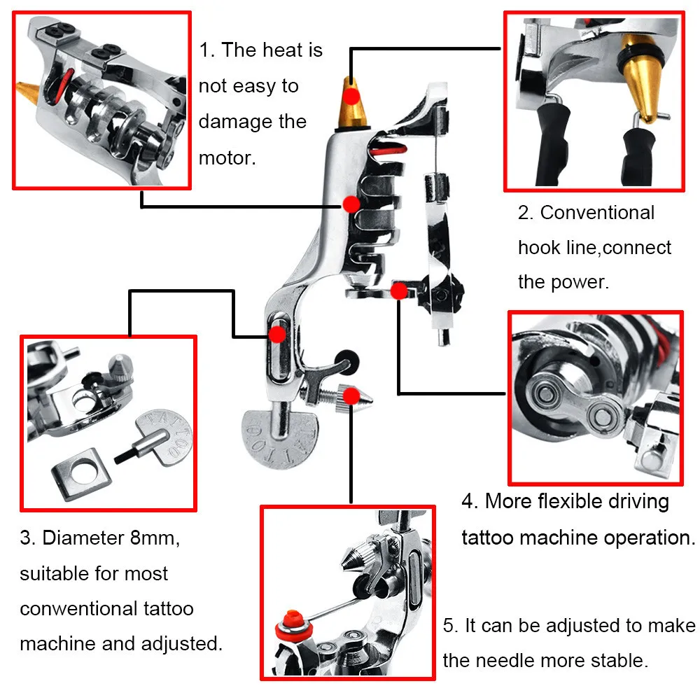 Профессиональный боди арт роторная Татуировка мотор машина шейдер оборудование Характеристика: Новый стиль роторной тату-машины-это высококачественная легкая роторная машина с системой регулировки слайдера от жесткого до мягкого удара на лету. Он чрезвычайно тихий во время бега и принимает все стандартные ручки, трубки, иглы и источники питания с клипкордом. 100% новый и высокое качество Тихий, низкий вибрационный и низкий нагрев Отличная стабильность и чувство, вам больше не нужно фиксировать иглу татуировки резиновыми каучуками и может избежать аварии свободной иглы Дизайн был разработан с учетом художников-татуировок и дополняет легкий вес Благодаря эргономичному дизайну, позволяющему длительное время татуировок. Прочные подшипники, долговечные детали Механический коммутационный графит Отличное соотношение объема/производительности Высокая эффективность Высокая надежность Размер: 10х10х3, 5 см Содержимое упаковки: 1X тату машина