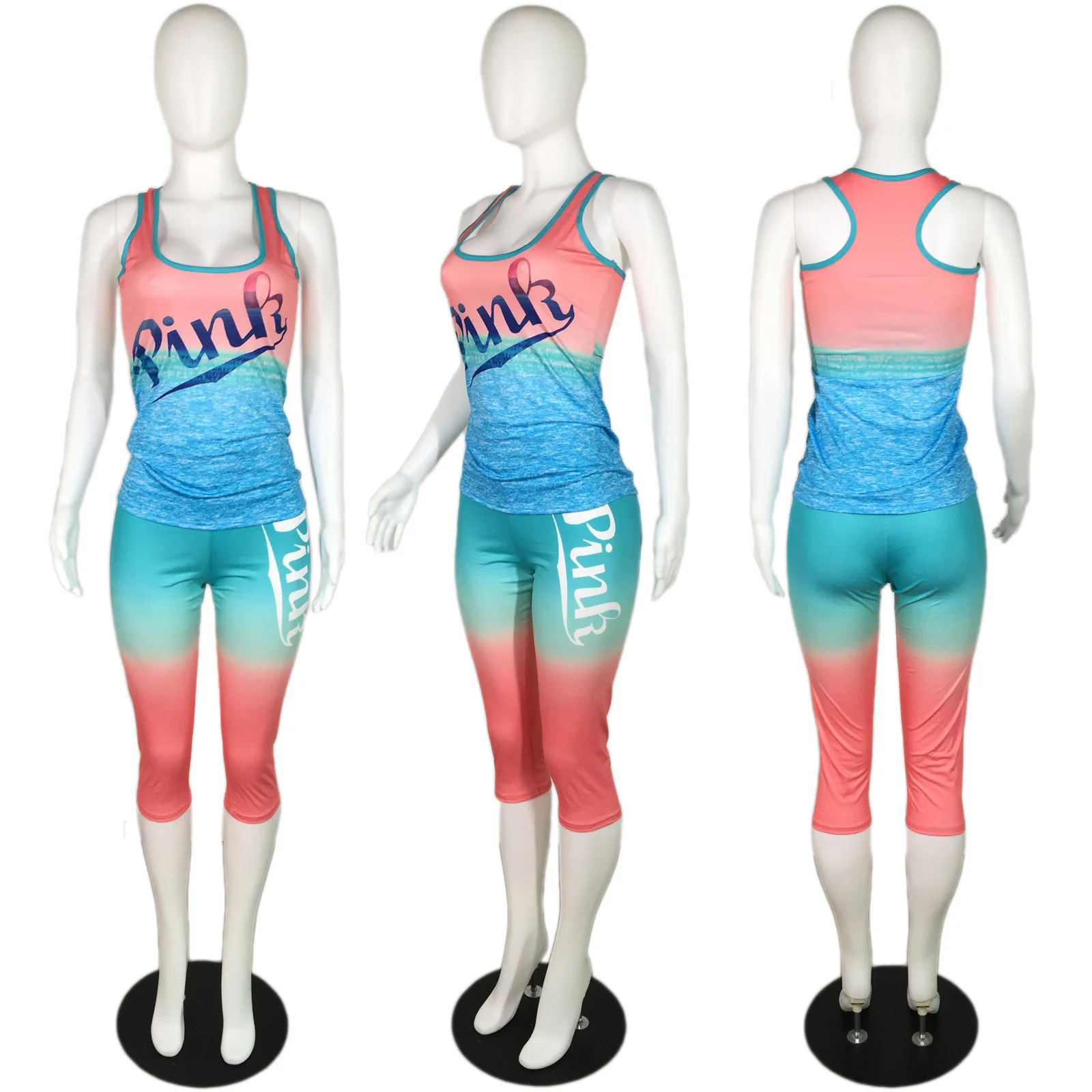 Женская спортивная одежда, розовый спортивный костюм, комплект из двух предметов, майка без рукавов, укороченные штаны, повседневный комплект из 2 предметов, лето 2019