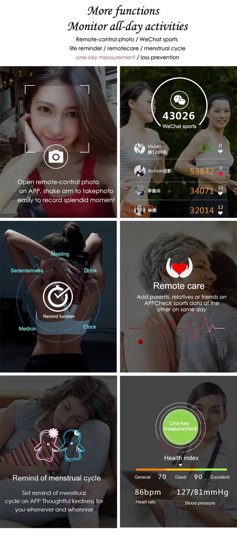 | Отображение времени/часов, шаг, калории, расстояние, сон, камера, включение/выключение дисплея |