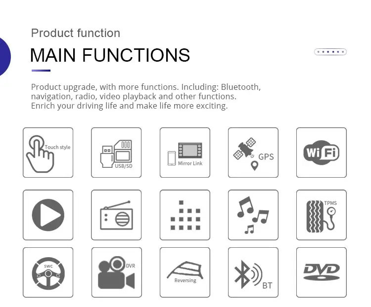 ОС:Система Android 11,0Процессор: ARM A7 4*1,2 GHz Quad(4) ядерОсновной Frenqency: 1,2 ГГцRAM:SAMSUNG 2 ГБ DDR3Nand Flash : 16 Гб1024*600 HD емкостный сенсорный экранGPS + BT + радио + AUX IN + DVR + Mirror-Link + DVD/CD-плеер и т. Д.Система:Операционная система Android 11.0, система Android и система транспортного средства интегрируют гармонию