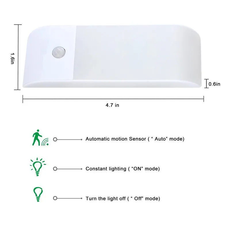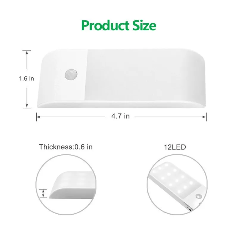Ультратонкий мини-светильник для шкафа Пассивный инфракрасный датчик движения и светильник датчика: в темное время суток, он будет светильник автоматически загорается, когда вы попадете в 10ft дальность обнаружения, и автоматический выход через 15 секунд после того, как вы выйдете из диапазона; Три режима: вкл/выкл/авто. Перезаряжаемый: Встроенный литиевый аккумулятор емкостью 600 мАч, он может работать в течение 4 часов при полной зарядке в режиме ON и последние 2 месяца в автоматическом режиме. Совместим с настенным зарядным устройством, usb-портом ПК; Высокая яркость, 12 шт высокояркие SMD СВЕТОДИОДНЫЙ чипы, экологически чистые и низкое энергопотребление; Простая установка: магнит и 3M клейкая лента, можно повесить и беспроводной инфракрасный датчик, который крепится без инструментов, болтов и гаек требуется при установке. Подходит для лестниц, ящиков, подножек, кладовки, спальни, гардероба, мастерской, книжной полки, чердака, шкафа, подвала, прихожей, коридора, изголовья, освещения багажника и т. д.