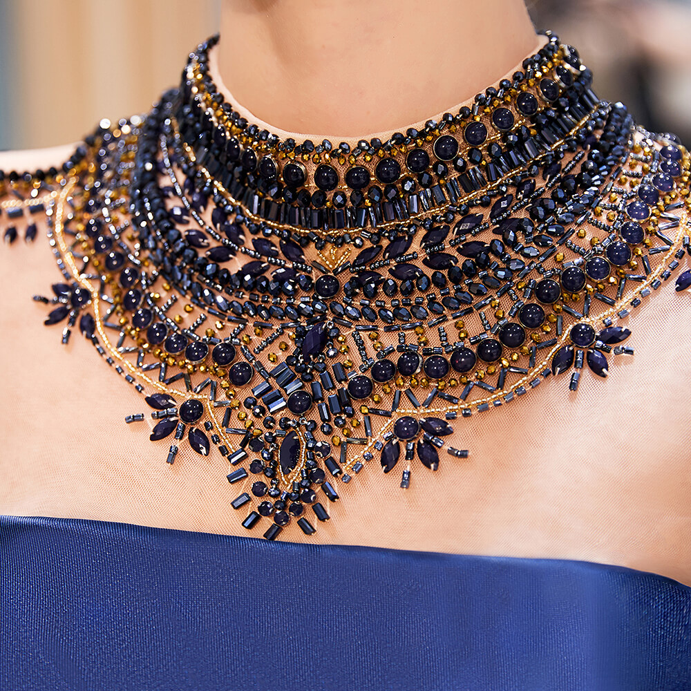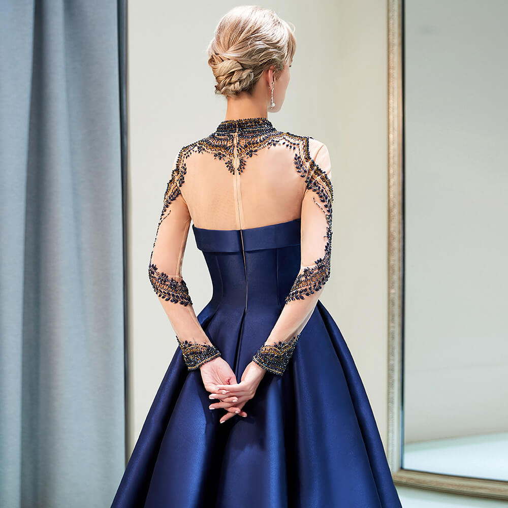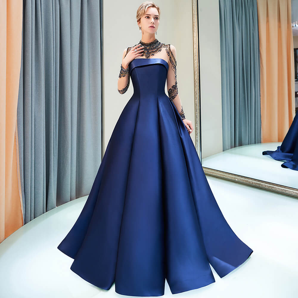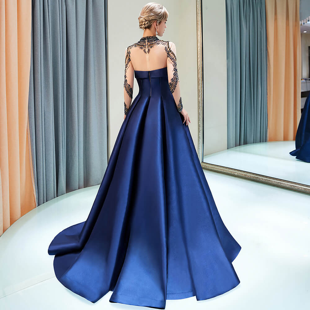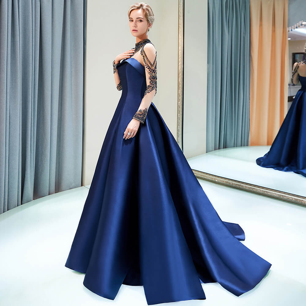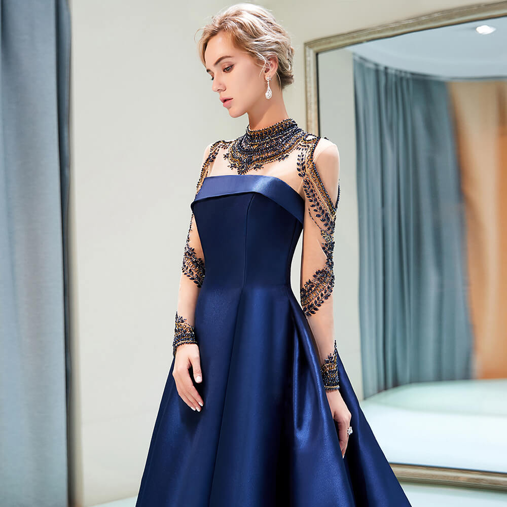 Элегантное блестящее платье темно-синего цвета, длинные платья для выпускного вечера 2019, вечерние платья с длинными рукавами, украшенные бисером, драпированные вечерние платья