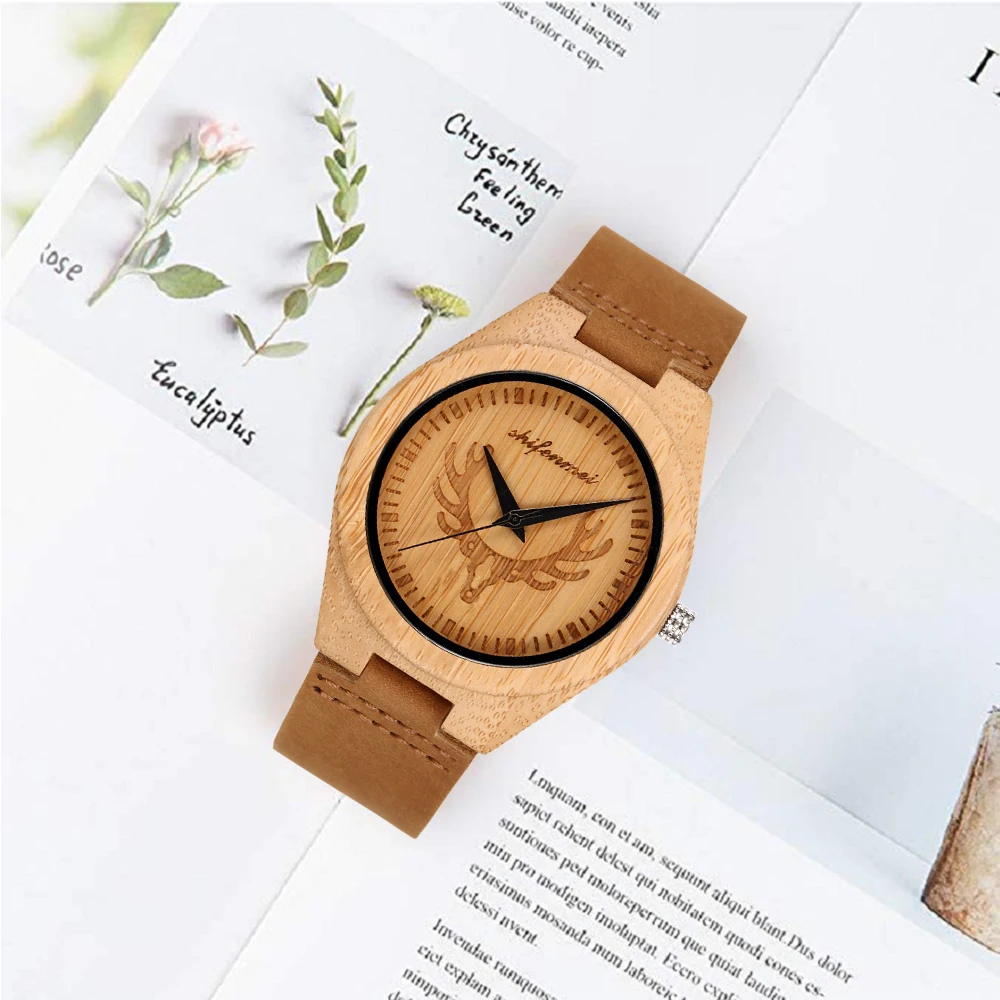 Men / women Watch Simple Pure Analog Bamboo Genuine Leather Mens Watches Luxury Quartz carving wristwatch