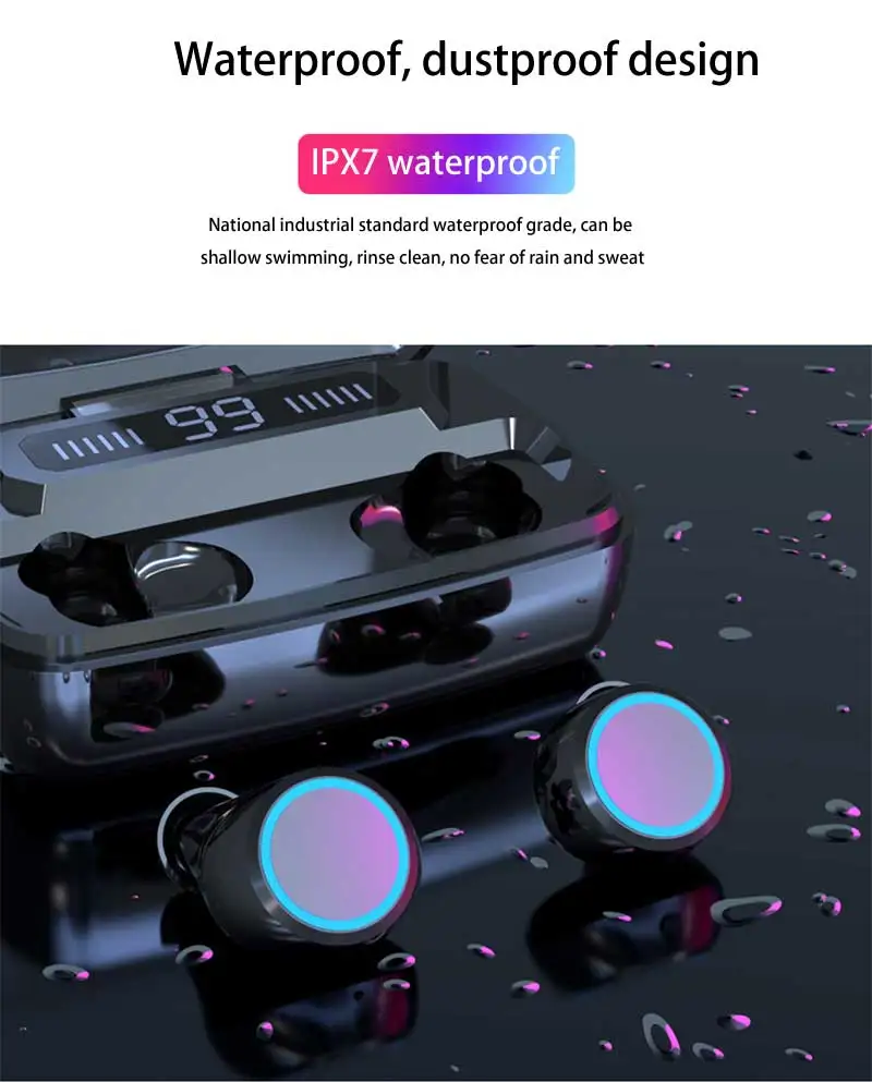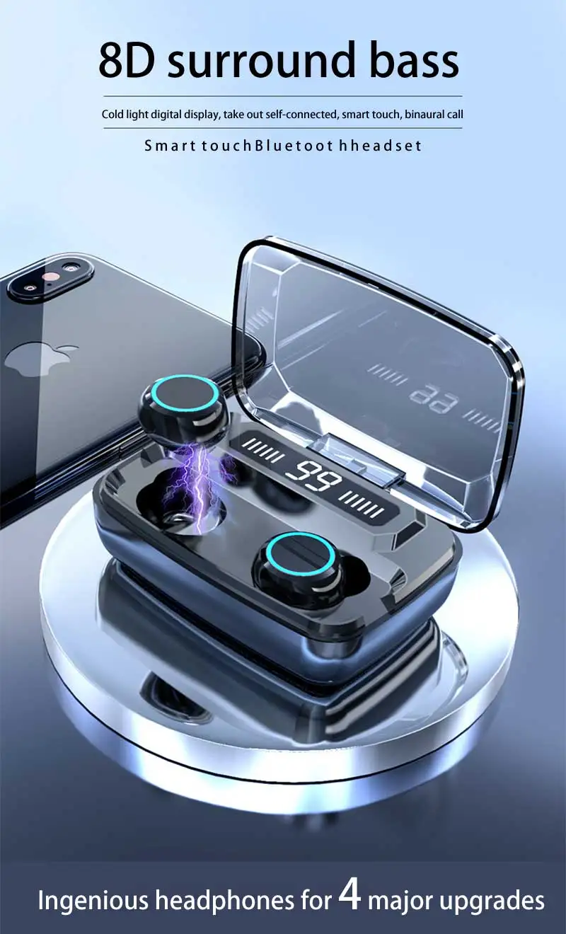 This true wireless Bluetooth earphones feature Bluetooth 5.0 chip, automatic boot pairing, built-in active noise reduction IC, HD call and large capacity lasting battery life.