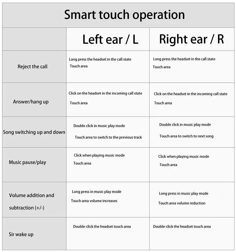 Smart Touch Operation: Automatic power on/off / answer / reject / last song / next song / call Siri.