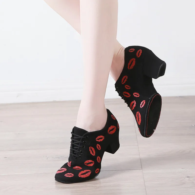 Красные, желтые, с принтом губ, современные танцевальные туфли для учителя, 5 см, квадратный каблук, ChaCha, дышащие, на шнуровке, с мягкой раздельной подошвой, для латинских танцев Женская обувь танго |