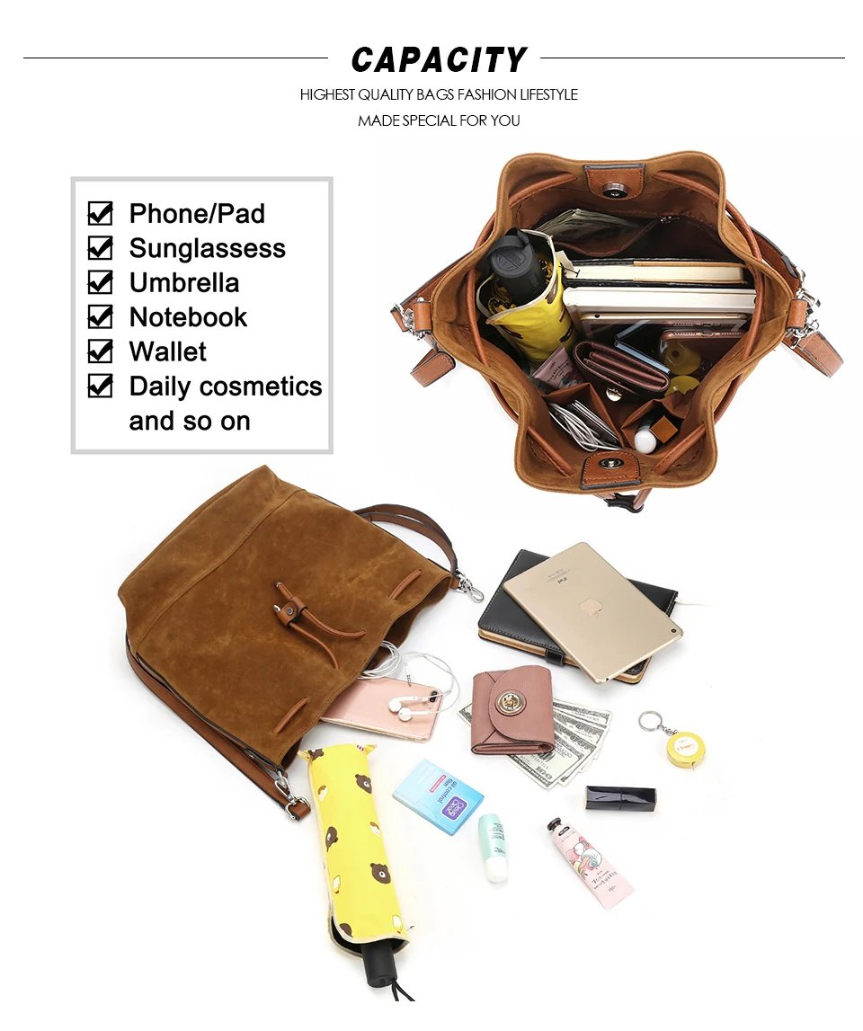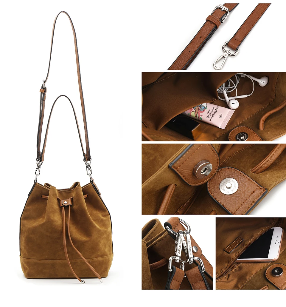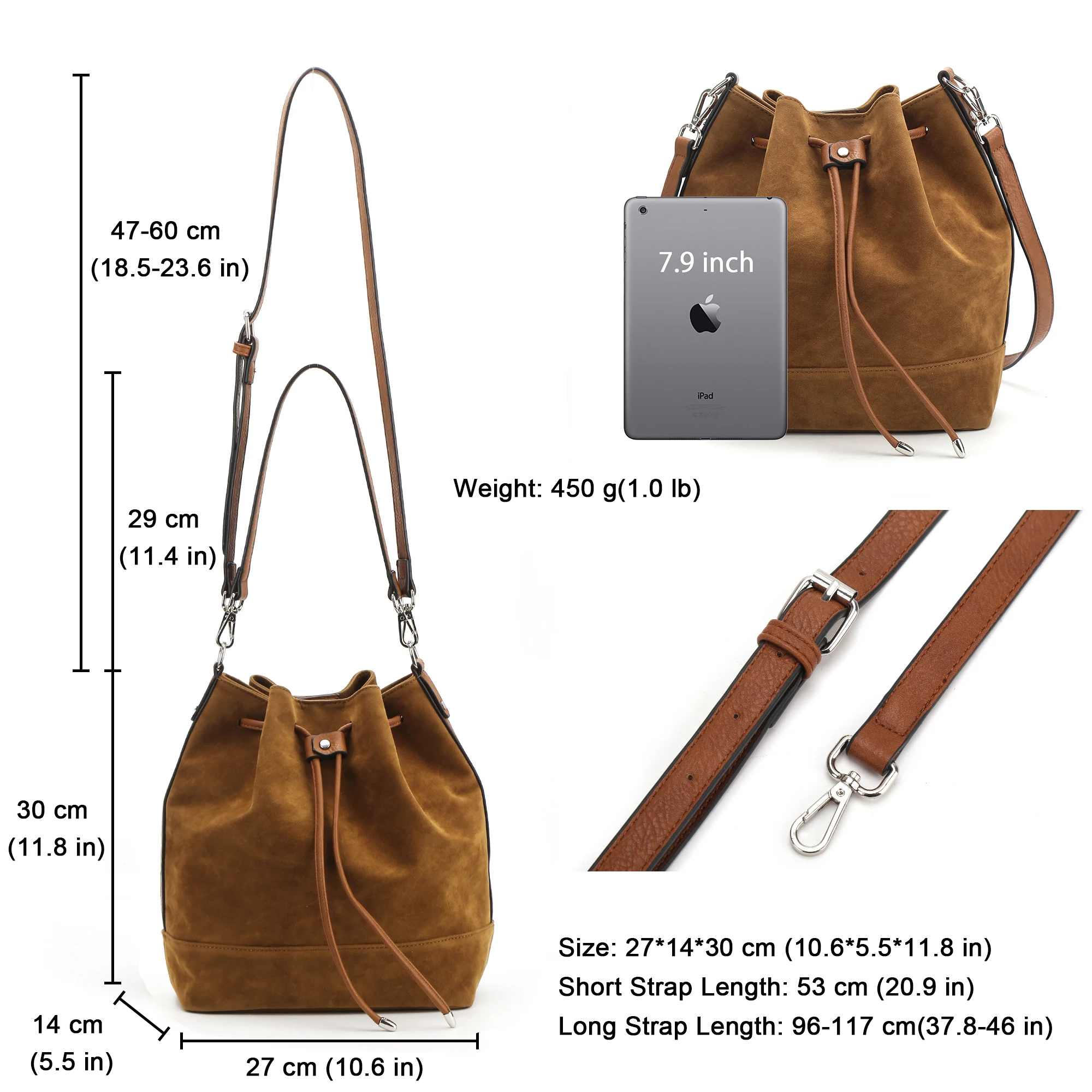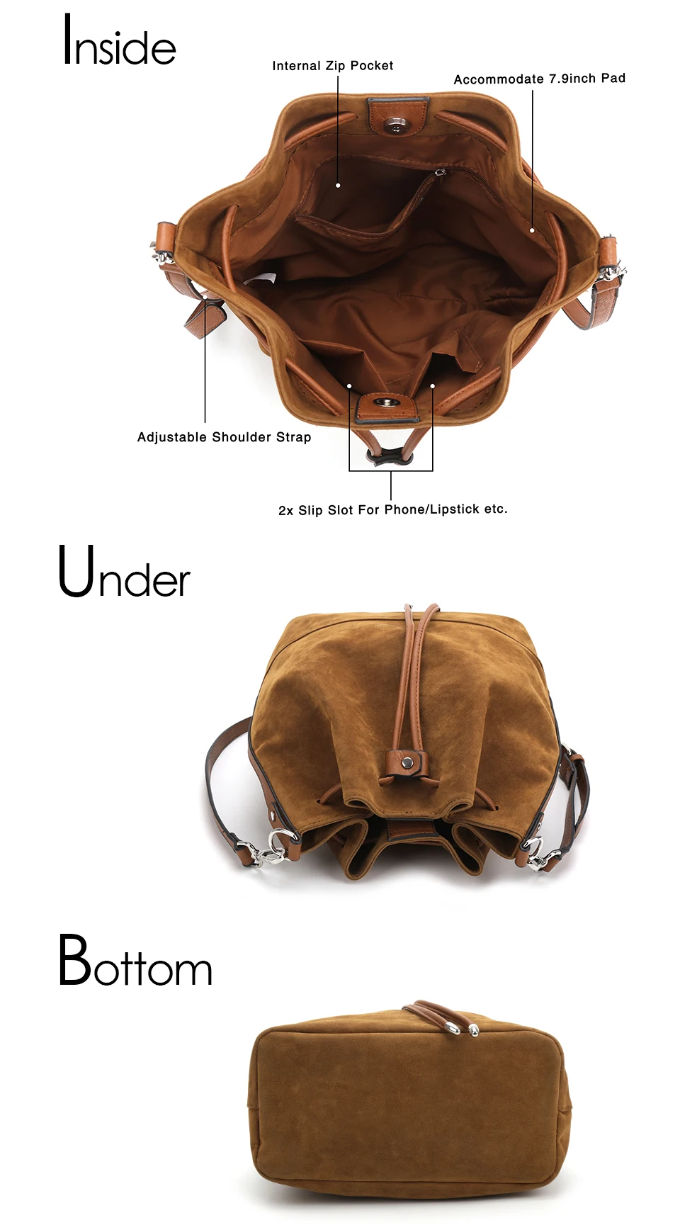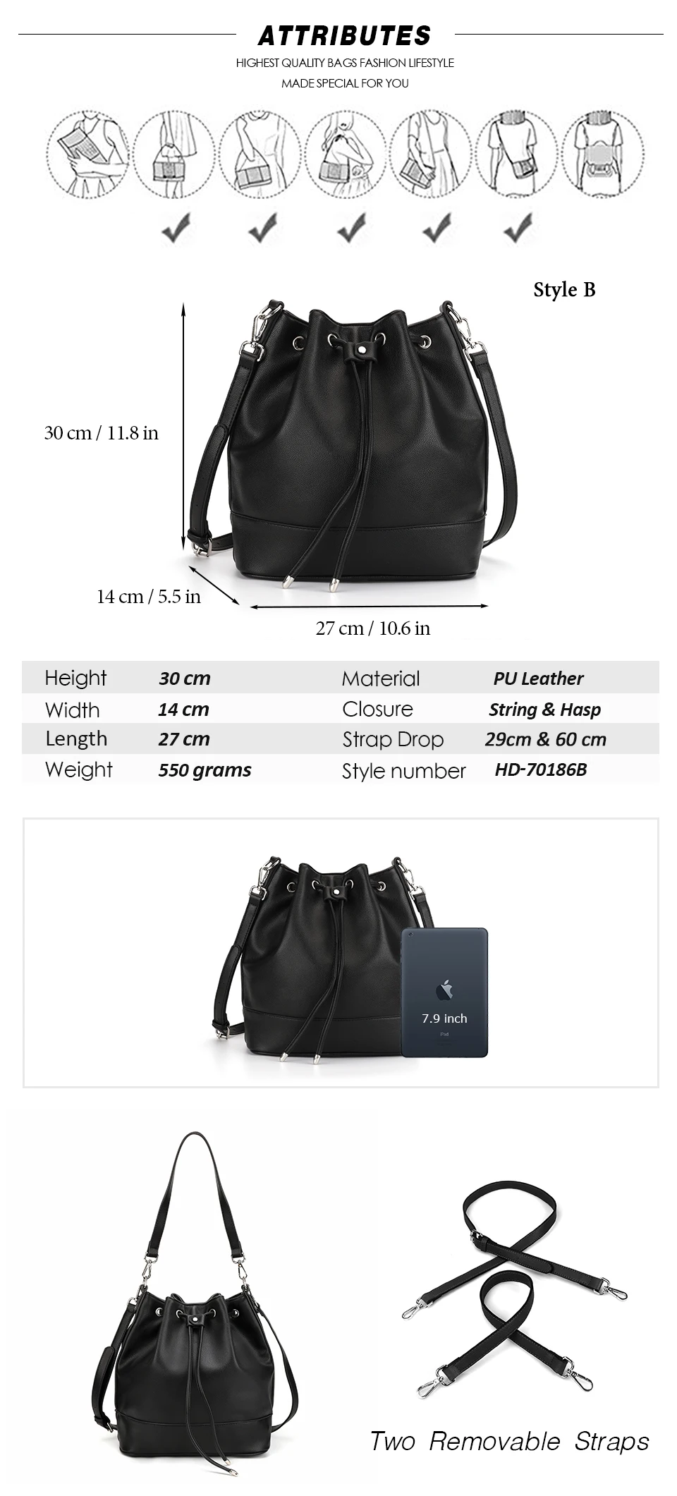 Стиль A: искусственная замша, застежка на магнитной застежке и шнурке, 1 внутренний карман на молнии и 2 внутренних кармана, 2 регулируемых коротких/длинных ремня. Стиль B: из искусственной кожи, застежка на магнитной застежке и шнурке, 1 внутренний карман на молнии и 2 внутренних кармана, 2 регулируемых коротких/длинных ремня. Примечание 1: 1 дюйм = 2,54 см, 1 см = 0,39 дюймов Примечание 2: особенностей цветопередачи на разных дисплеях цвет изображения может несколько отличаться из-за настроек монитора компьютера. Примечание 3: при разнице в способе измерения допускается отклонение в размере на 1-3 см.