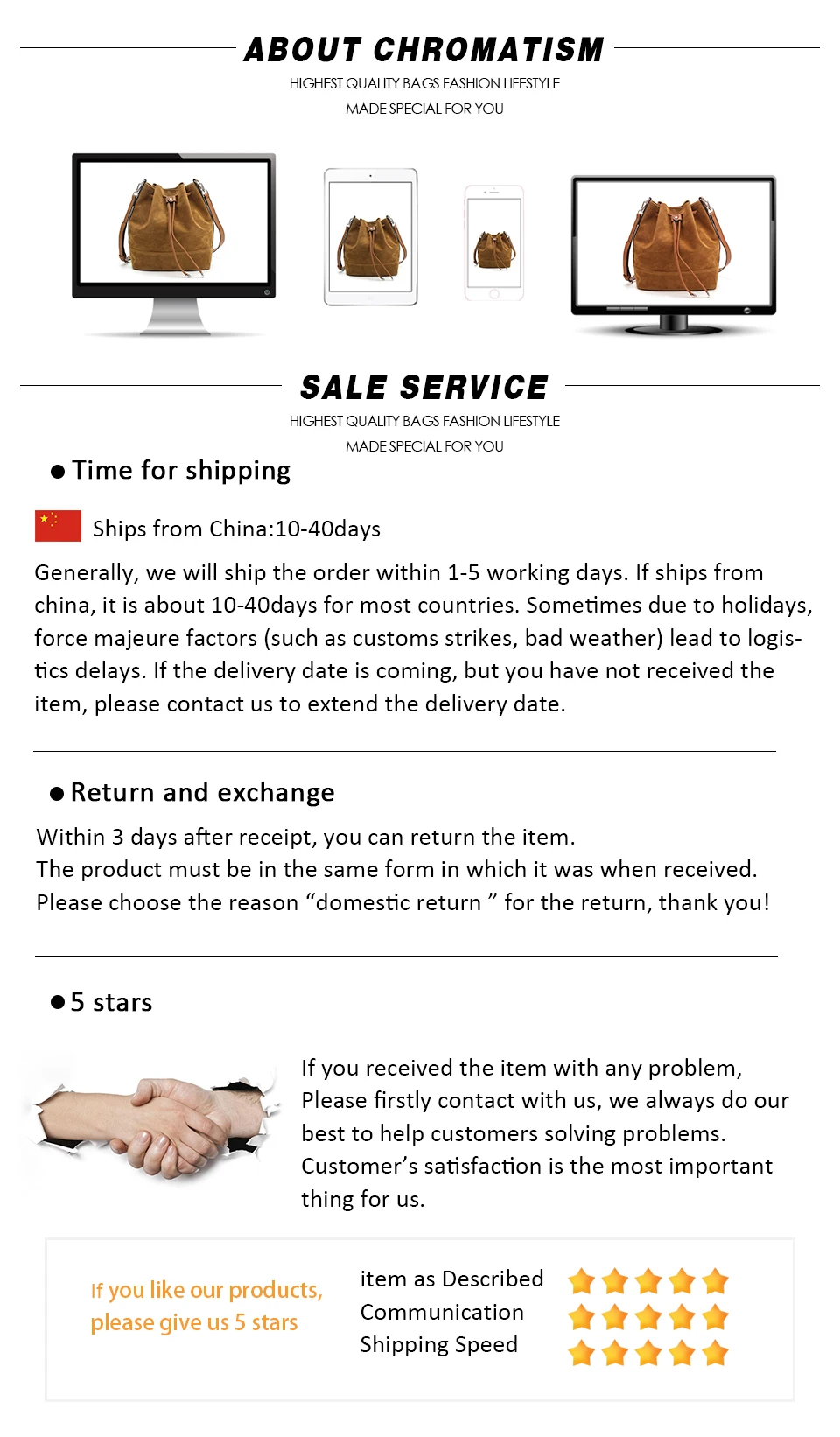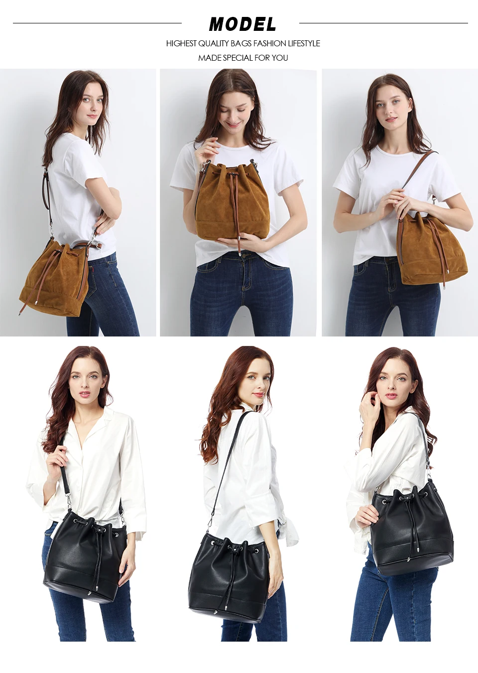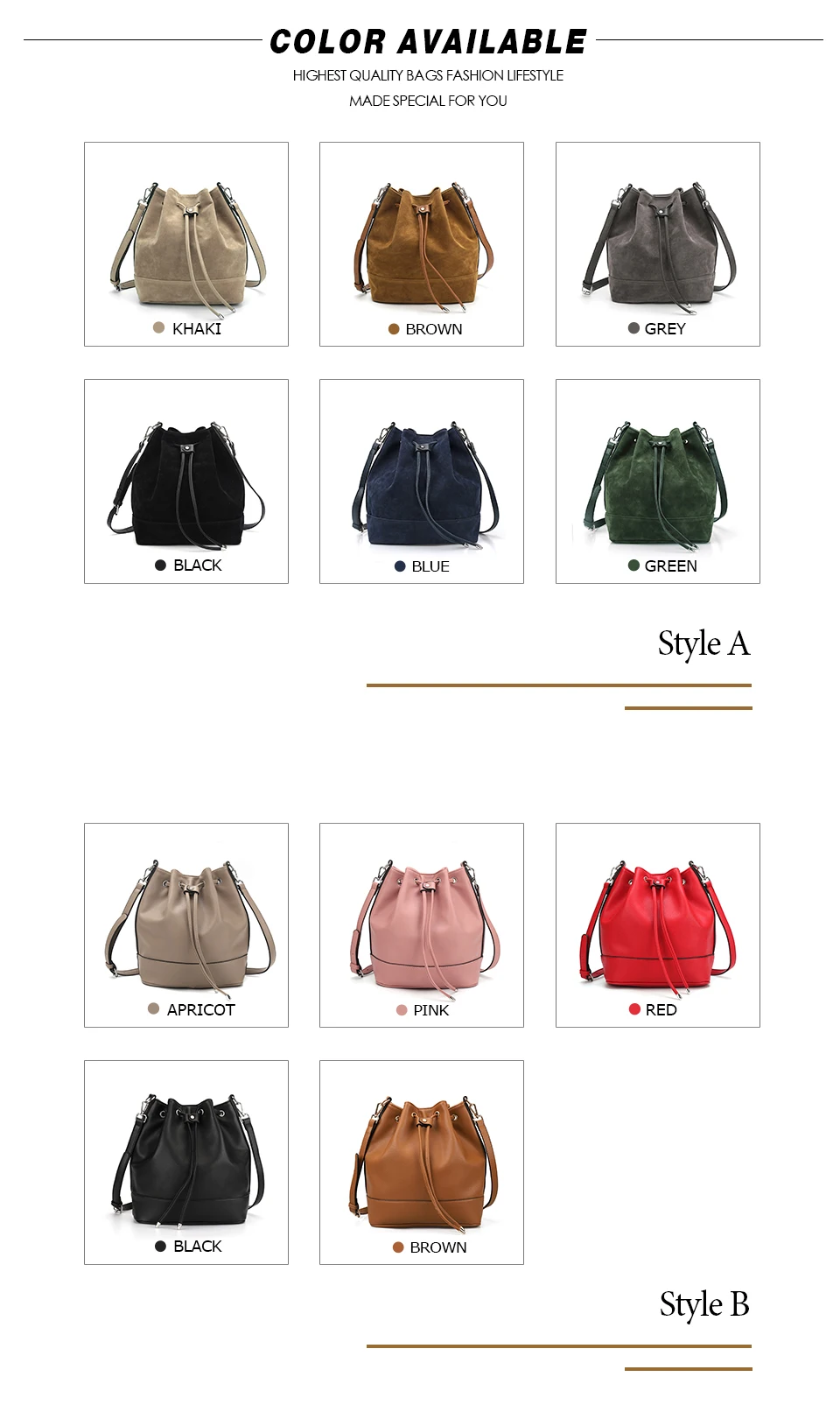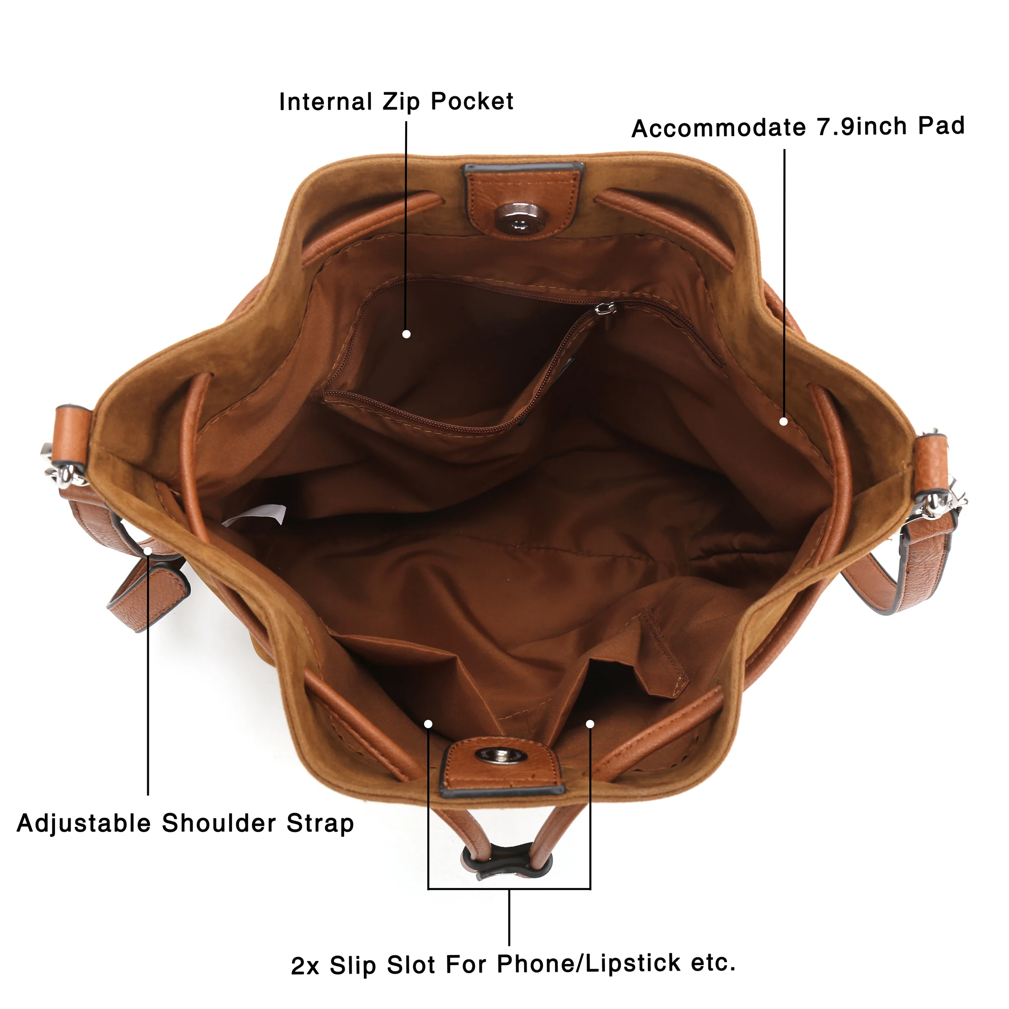 Стиль A: искусственная замша, застежка на магнитной застежке и шнурке, 1 внутренний карман на молнии и 2 внутренних кармана, 2 регулируемых коротких/длинных ремня. Стиль B: из искусственной кожи, застежка на магнитной застежке и шнурке, 1 внутренний карман на молнии и 2 внутренних кармана, 2 регулируемых коротких/длинных ремня. Примечание 1: 1 дюйм = 2,54 см, 1 см = 0,39 дюймов Примечание 2: особенностей цветопередачи на разных дисплеях цвет изображения может несколько отличаться из-за настроек монитора компьютера. Примечание 3: при разнице в способе измерения допускается отклонение в размере на 1-3 см.