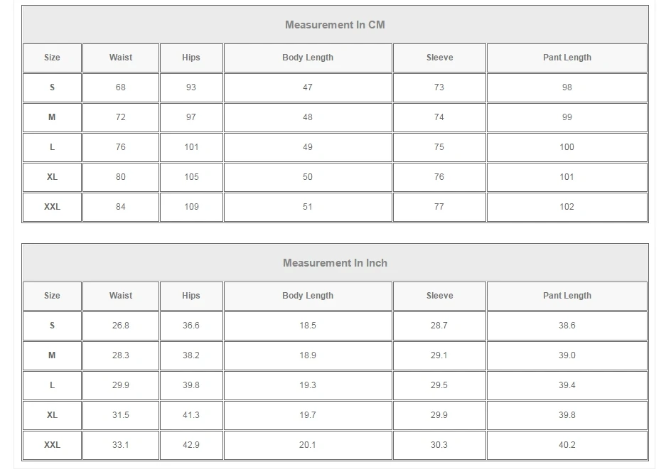 | Размер | Талия | Бедра | Длина корпуса | Рукав | Длина брюк |