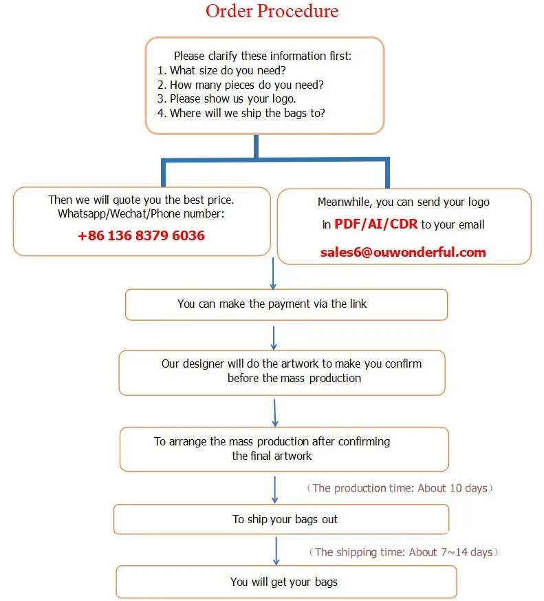 Время выполнения заказа:Как правило, нам нужно около 10 дней для производства и 7-14 дней для отправки товаров, в зависимости от количества и вашего логотипа.