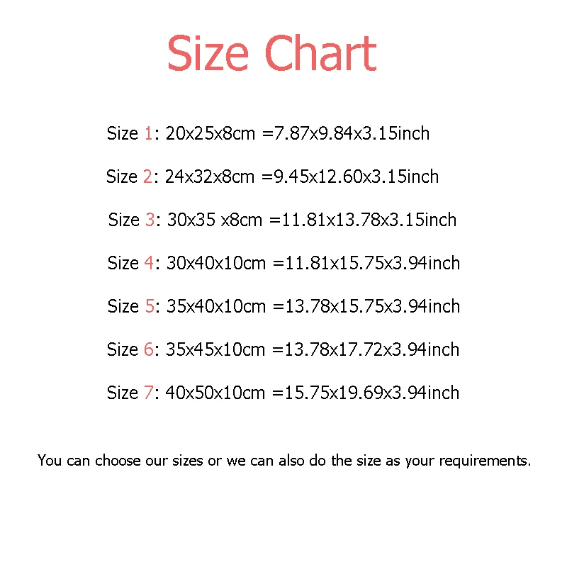 Вы можете выбрать наши размеры или мы можем также сделать размер согласно вашим требованиям.