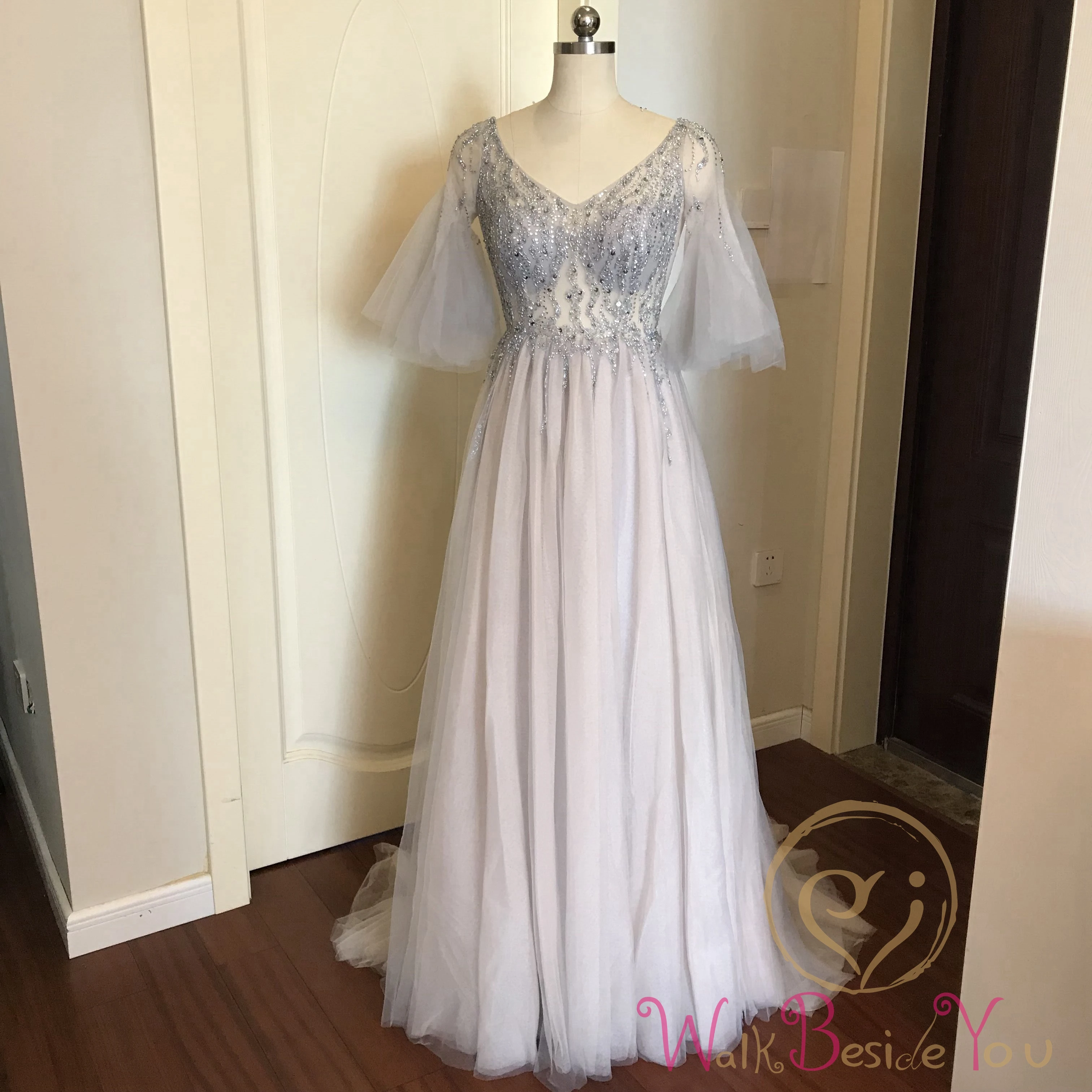 Вечернее платье цвета шампанского, расшитое бисером, с короткими рукавами, с аппликацией, с коротким шлейфом, с высоким разрезом, с v-образным вырезом, ТРАПЕЦИЕВИДНОЕ платье для выпускного вечера