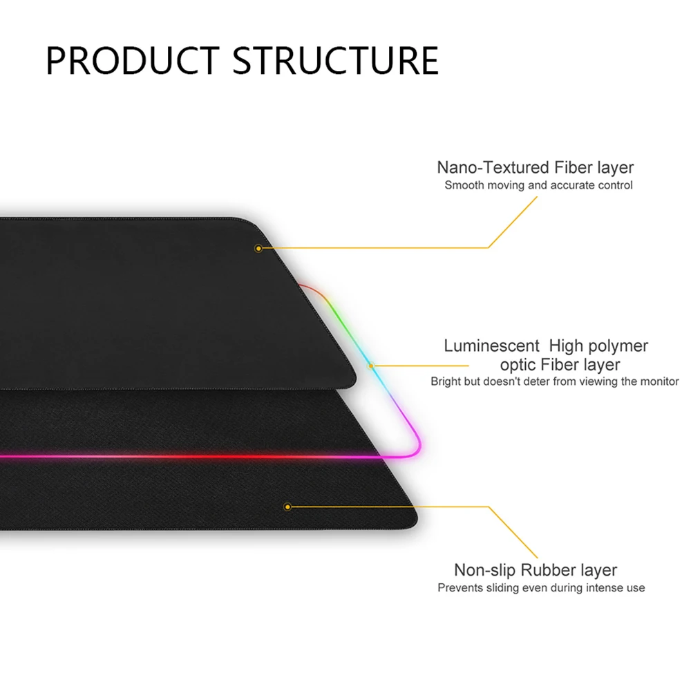 Супер светящееся волокно и Мягкая тканевая поверхность с нескользящей резиновой основой могут надежно захватывать рабочий стол, обеспечивая точное управление мышью, когда мышь движется быстро.