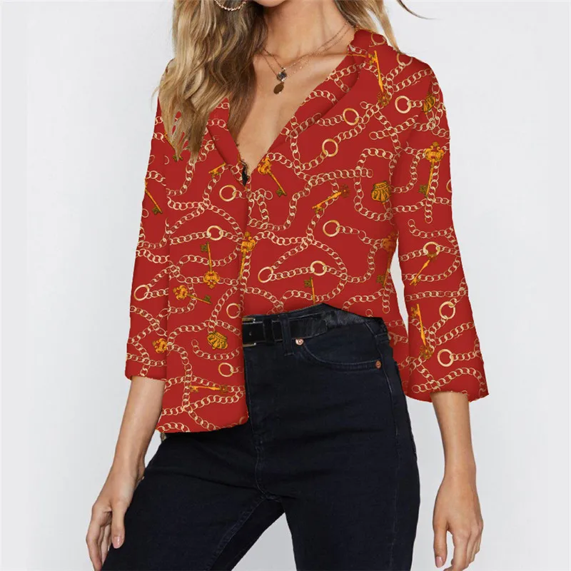 2019 летняя шифоновая блуза для женщин, повседневная, 3/4 рукав, отложной воротник, Офисная рубашка, винтажная, с цепью, с принтом, женские блузки, топы, блузы
