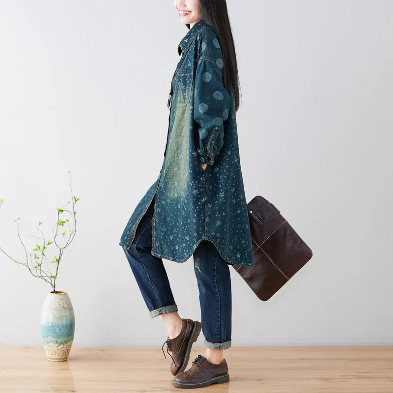 Название: 2019 новые женские весенние туфли в Корейском стиле Повседневная одежда размера плюс с длинными руками и принтом б/у сверхпрочный все-матч Свободная джинсовая рубашка