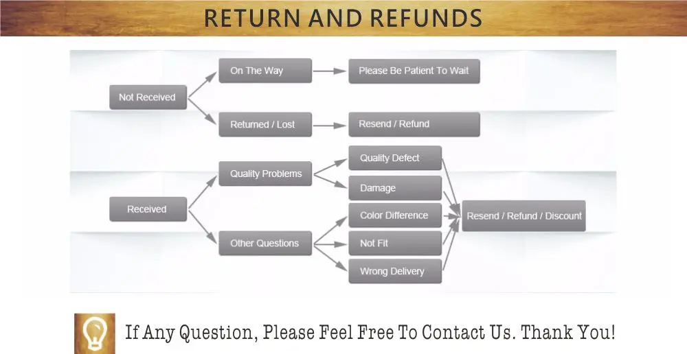 Мы тщательно проверим каждый товар перед отправкой, однако некоторые из них могут быть повреждены во время транспортировки, Если вы обнаружите какие-либо проблемы с качеством, пожалуйста, свяжитесь с нами в течение 15 дней после получения, мы отправим вам новый продукт или вернем вам оплату. |