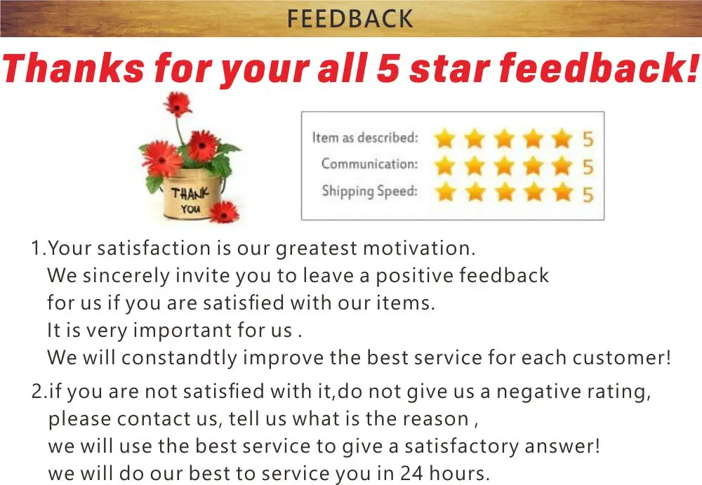 По какой-либо причине вам это не нравится или вы просто хотите вернуть товар, Пожалуйста, свяжитесь с нами в течение 15 дней после получения, сохраните товары в первоначальном состоянии и Оплатите стоимость доставки самостоятельно, Мы полностью вернем деньги после получения возвращенных товаров По любой причине вы не удовлетворены своим заказом, Пожалуйста, не спешите оставлять отзывы и открывать спор, Пожалуйста, не стесняйтесь связаться со мной. Мы гордимся нашим отличным обслуживанием и сделаем все возможное, чтобы решить любую вашу проблему. |