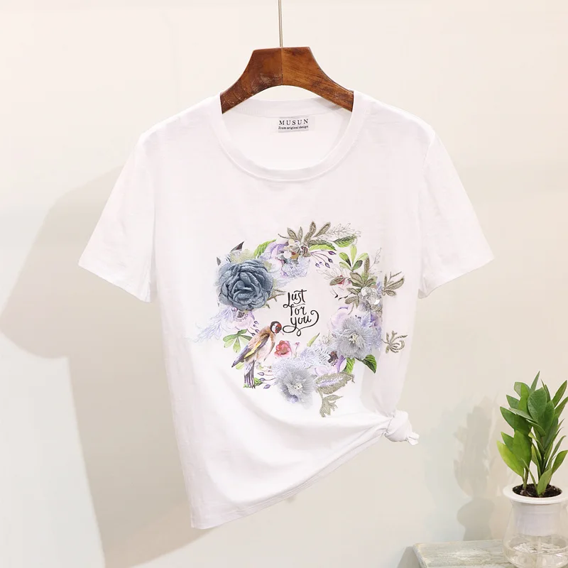 2019 летние женские комплекты из двух предметов 2019 Новый вышитый бисером цветок и птица печати костюм Harajuku 3D футболки с цветочным узором + рваные джинсы повседневные Костюмы