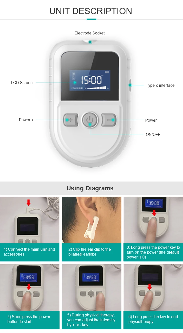 Электроды с зажимом для ушей должны быть правильно закреплены в двухсторонних мочалках, в противном случае терапевтический инструмент не будет работать должным образом. И, пожалуйста, выберите подходящую интенсивность мощности в соответствии с вашей чувствительностью