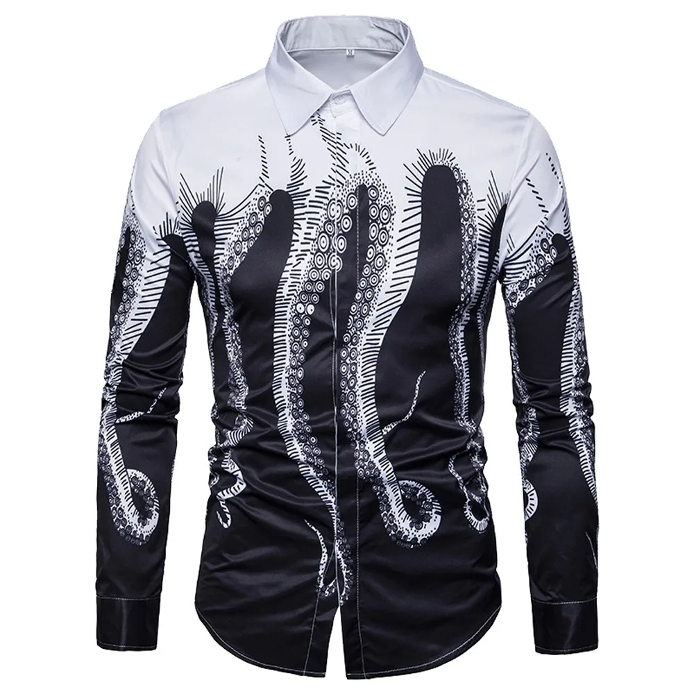 Мужская 3D Печать Осьминог рубашка повседневная с длинным рукавом Slim Fit свитеры с пуговицами вниз блузка