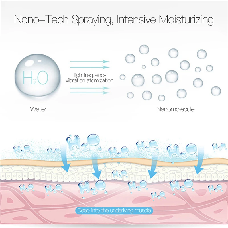 【Технология нано распыления 】высокотехнологичные чипсы и Ультра Высокоскоростная вибротехника принимаются, лицо mister превращает воду в тонкий и гладкий ультрамикрон, чтобы проникать в кожу, увлажняя и освежая вашу кожу.