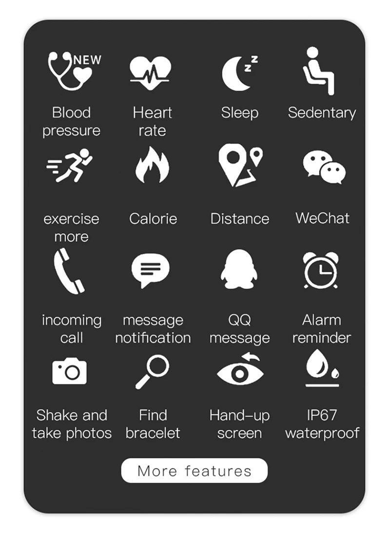 Спортивные умные часы женские кровяное давление водостойкая активность фитнес-трекер монитор сердечного ритма Смарт-часы GPS Android ios Функция Описание 1. Спортивная запись (шагомер, тренажер для сжигания калорий, пробег, может отображать трендовую диаграмму каждого периода времени). 2, мониторинг сна (может показать тренд качества сна в период времени) 3, динамический и статический пульсометр кровяное давление кислородная усталость функция мониторинга 4, функция мониторинга усталости кислорода в крови 5, поддержка напоминания о звонках, SMS, WeChat, QQ push, напоминание о тревоге 6, поддержка камеры дистанционного управления, Браслет Поддержка секундомер функция, gps трек запись 7, функция тренировки: ходьба, бег, Велоспорт, альпинизм параметр Описание 1, Bluetooth чип 4,0, 0,96 цветной экран 2, Epco микро оптический датчик 3, основной пластиковый материал, ремешок на запястье ТПУ материал 4, одна сенсорная кнопка операции 5, батарея 180 мАч, Время зарядки 2 ч, режим ожидания более 7 дней 6, требования к оборудованию: Android 5,0, IOS 9,0 и выше систем 7, применимая платформа android платформа, Apple iOS платформа 8, поддержка SMS Язык: английский, испанский, французский, голландский, немецкий, итальянский, японский, корейский, португальский (Бразилия), Русский, упрощенный китайский, и традиционный китайский; посылка включает: 1x Цвет коробка 1x Руководство 1x B2 smart watch 1 xCharging кабель