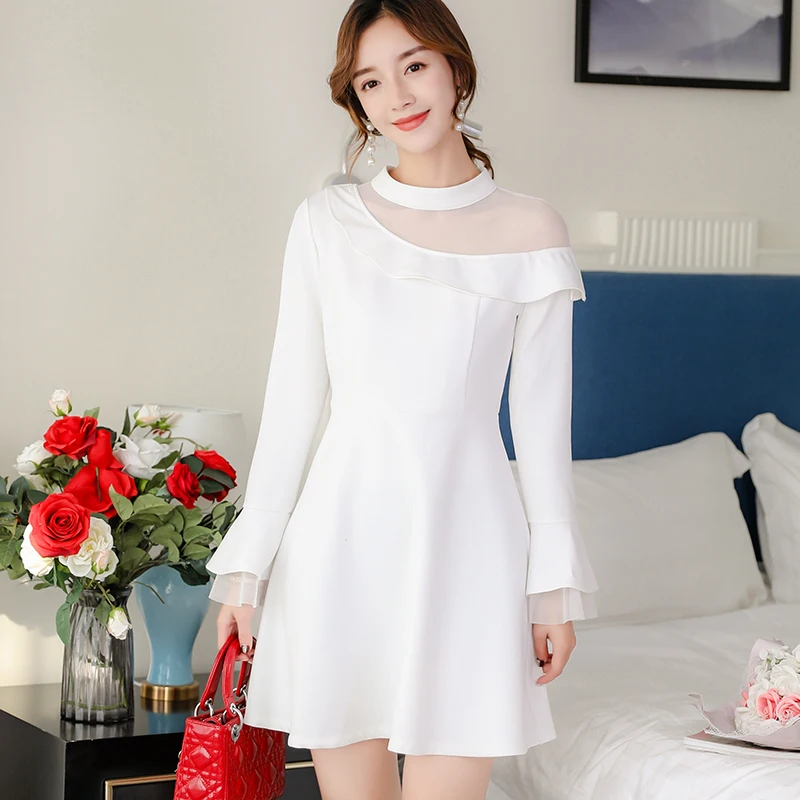 2019 spring summer women fashion white dress lady casual slim long sleeve dress club dress