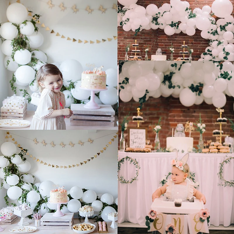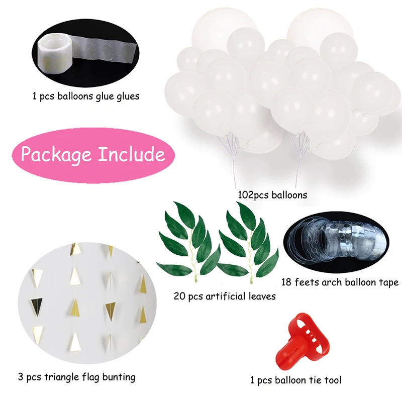 Посылка включает в себя: 102 шт. белые шары (включая 30 шт., 12 дюймов, 30 шт., 10 дюймов, 40 шт., 5 дюймов, 2 шт., 36 дюймов) + 3 комплекта3 мВымпел Флаги баннеров + 20 наборов искусственных листьев + 1 рулон шар в форме арки ленты + 1 инструмент для завязывания воздушных шаров + 1 рулон наклеек на 100 точек.