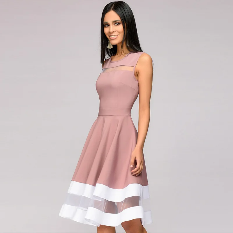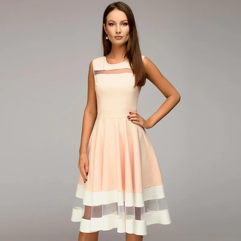 Летние женские платья 2019 с круглым вырезом без рукавов перспективное Сетчатое платье с вышивкой элегантное женское ТРАПЕЦИЕВИДНОЕ винтажное платье по колено