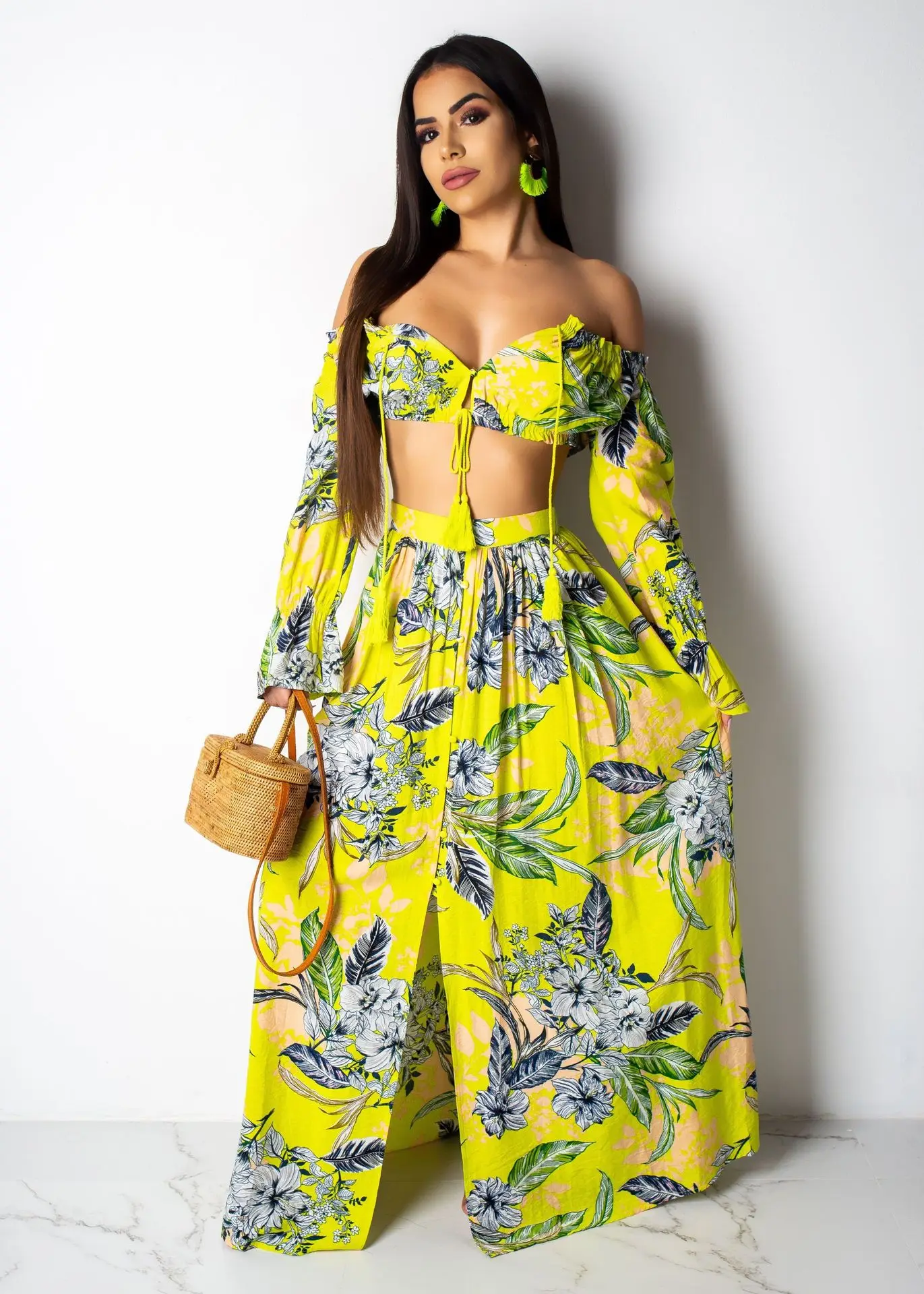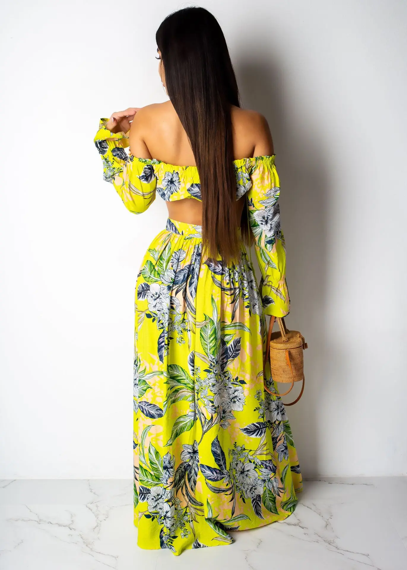 Женский сексуальный комплект из 2 предметов, Бандажное платье с открытыми плечами и длинным рукавом, Топы без бретелек + длинная юбка макси, летние пляжные платья, наряд