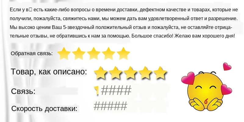 Мы обеспечиваем лучшее качество продукции и обслуживание клиентов. И наши специалисты по обслуживанию клиентов всегда готовы решить любую вашу проблему. Если у вас есть какие-либо вопросы о времени доставки, неудовлетворительном качестве и не получении товара, пожалуйста, свяжитесь с нами, мы сможем дать вам удовлетворенный ответ и решить вопрос. Мы будем благодарны вам за положительный 5-звездочный отзыв. Просим не оставлять отрицательных отзывов, не обратившись перед этим за помощью. Приятного дня.